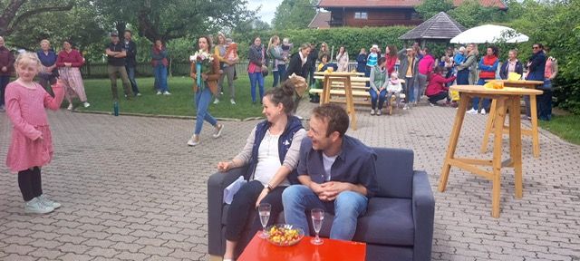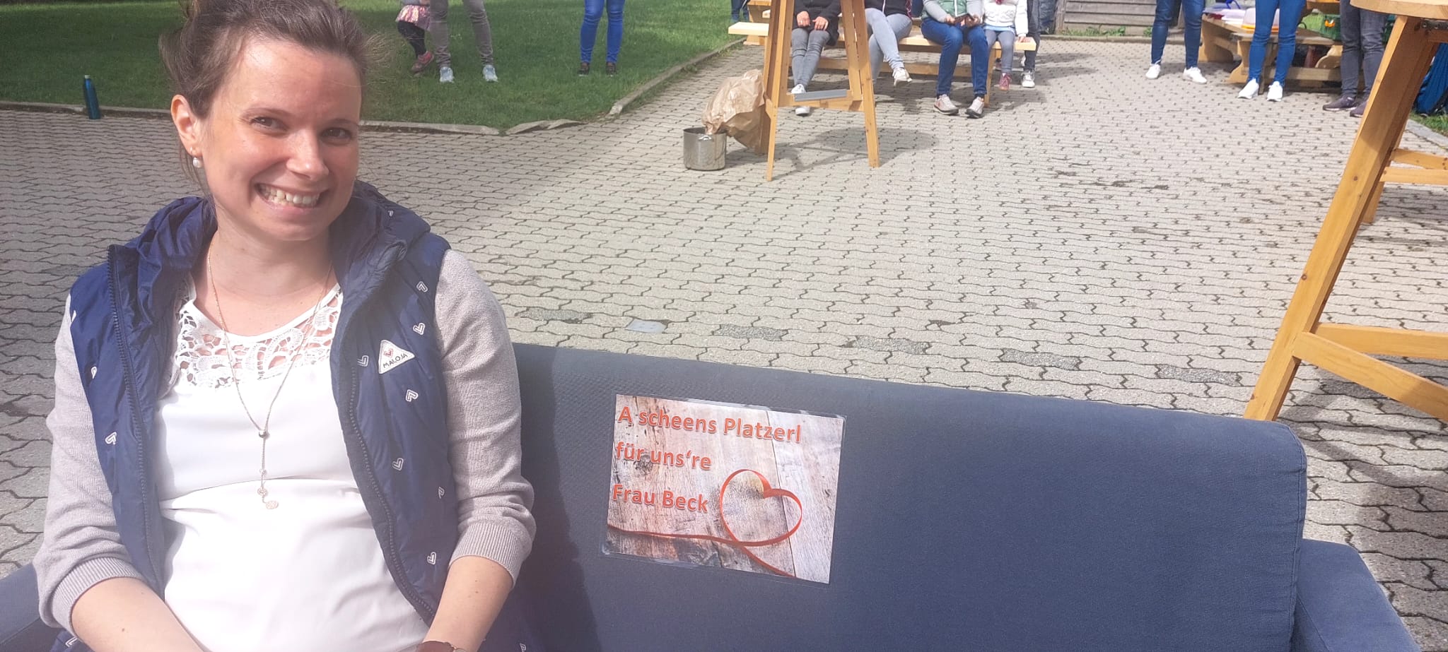 Trost und gleichzeitig eine Menge Freude spendete der Cup-Song-Beitrag der 3/4 Klassen inkl. bebilderter Untermalung der Kl.1/2b, denn sie stellten zum gleichnamigen Lied eines weltbekannten Musikers fest: "Alles wird gut sowieso, immer geht ne neue Tür auf irgendwo... und wenns grad nicht so läuft wie gewohnt - egal, es wird gut SOWIESO!" Ohnehin wollten es alle SchülerInnen unserer Frau Beck noch ein letztes Mal so richtig schön machen und somit begann die Verabschiedung nach dem traditionellen Kinder-Spalier gemütlich auf dem Schulsofa mit Waller Leitungswasser und einer Menge Nimm2 Softies. Für das leibliche Wohl war also gesorgt! Doch so richtige Entspannung sollte sich nicht einstellen, denn die Emotionen waren größer. Schließlich bedankten sich die Kinder der Klasse 1/2a bei ihrer Klassenlehrerin mit einem selbstgeschriebenen Gedicht und einer netten Foto-CD - überreicht von der Klassenelternsprecherin. Nach einigen persönlichen Worten von Frau Staude, welche zusätzlich einen Blumenstrauß vom Lehrerkollegium überreichte, galt es viele Hände zu schütteln und letzte liebe Worte des Elternbeirates und vieler Eltern entgegen zu nehmen. Die Teilnahme war Spitzenklasse, was nicht zuletzt an den gespendeten Kuchen, dem leckeren Kaffee und einigen weiteren Getränken lag. Vergelts Gott dafür!
