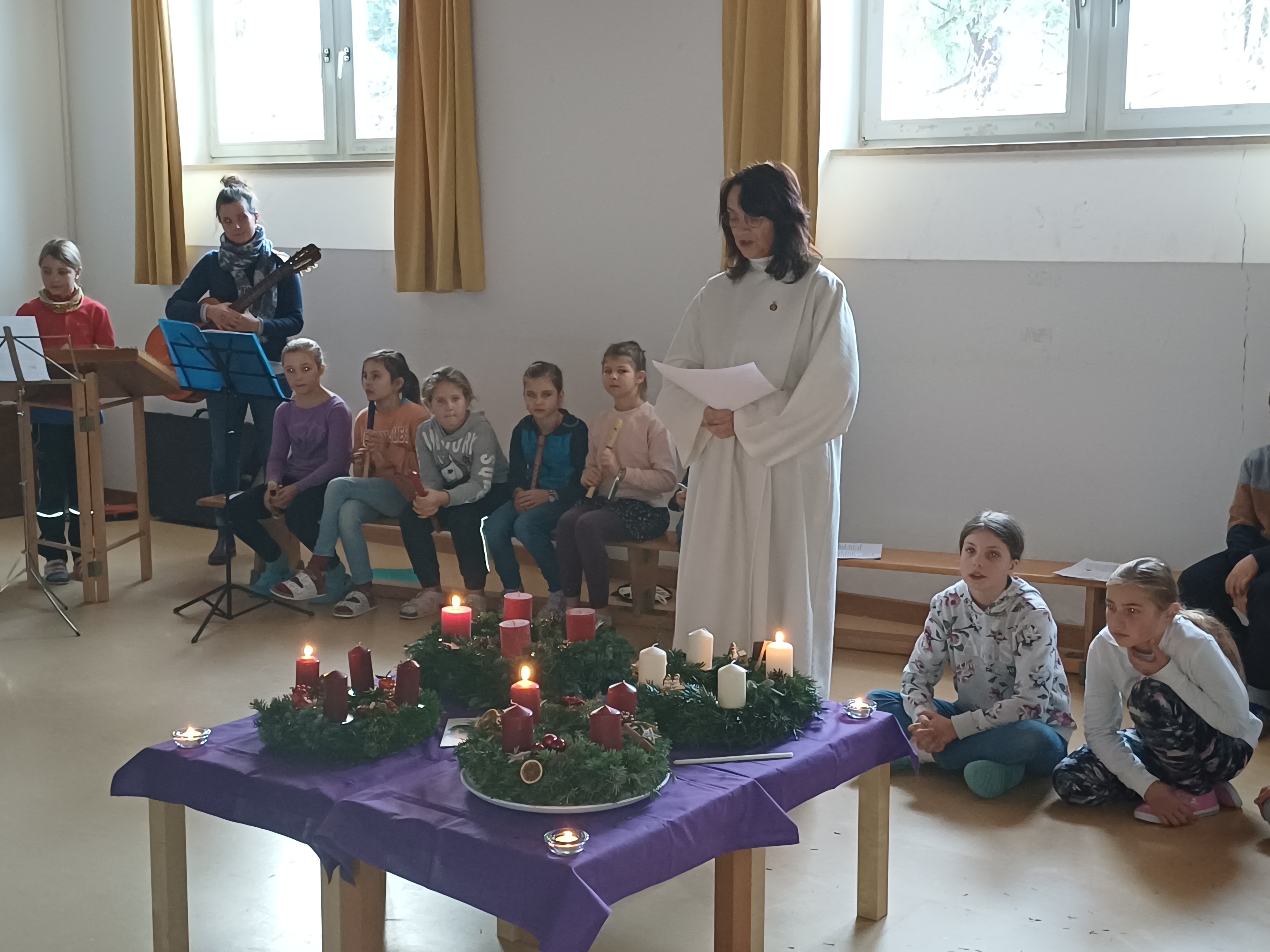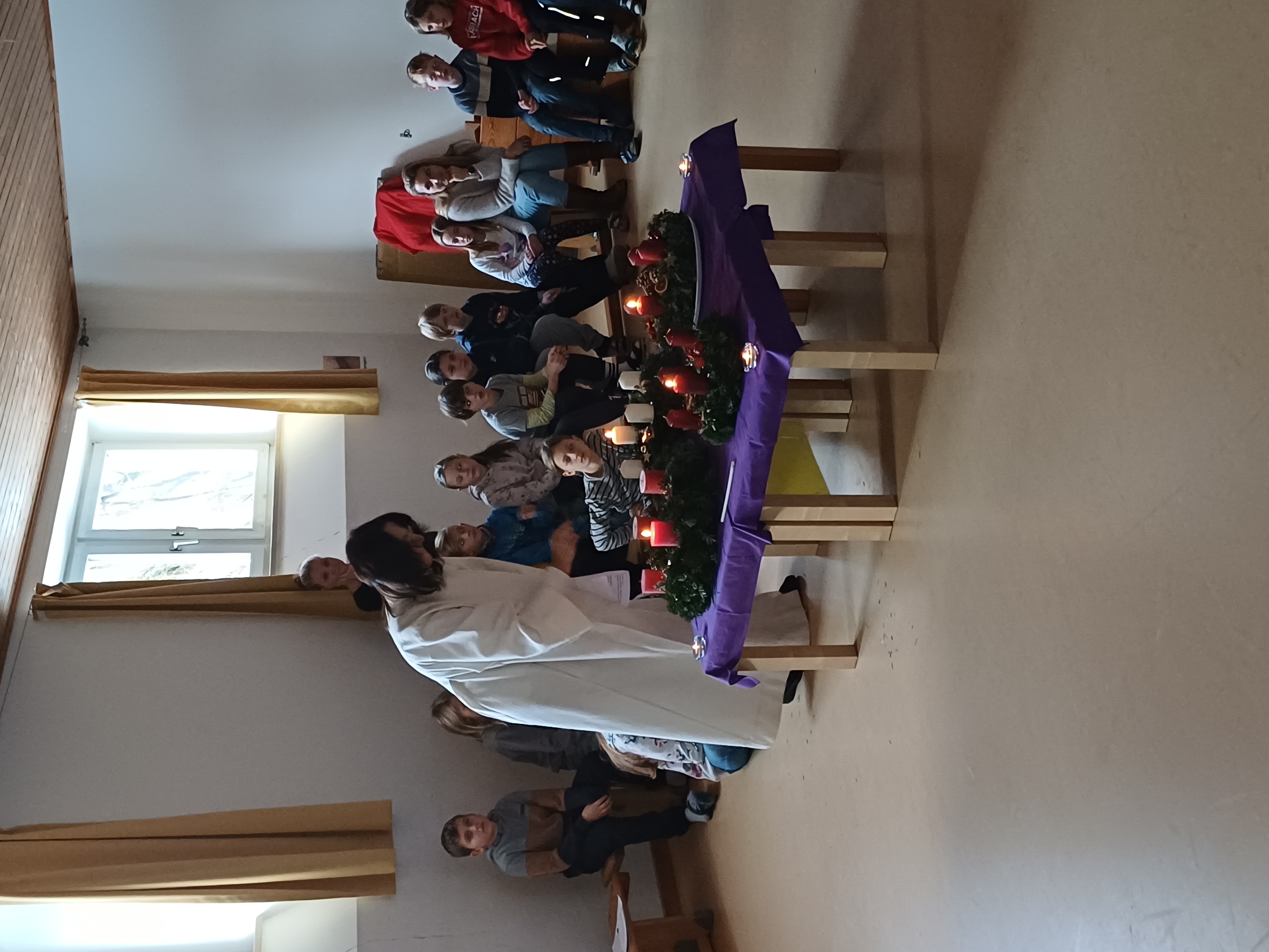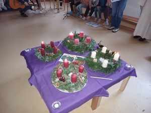 Am Mittwoch, den 6.12.23 feierten wir in der Turnhalle eine kleine Andacht. Im Mittelpunkt standen die Klassen-Adventskränze und deren Bedeutung: Eine Vorbereitungszeit mit violetter Liturgiefarbe, die auf die Ankunft von Jesus wartet. Die Segnung mit Weihwasser soll uns bewusst machen, dass Gott uns durch diese besondere Zeit begleitet. Den Brauch des Adventskranzes gibt es seit fast 200 Jahren. Die Idee stammt von dem Erzieher Johann Wichern aus Hamburg. Die Kinder hatten ihn immer wieder gefragt, wann endlich Weihnachten sei. Im Jahr 1839 baute er für sie einen Adventskranz aus Holz. Dieser hatte vier große Kerzen für die Sonntage und kleine Kerzen für die anderen Tage bis Heiligabend. Jeden Tag wurde eine Kerze angezündet.