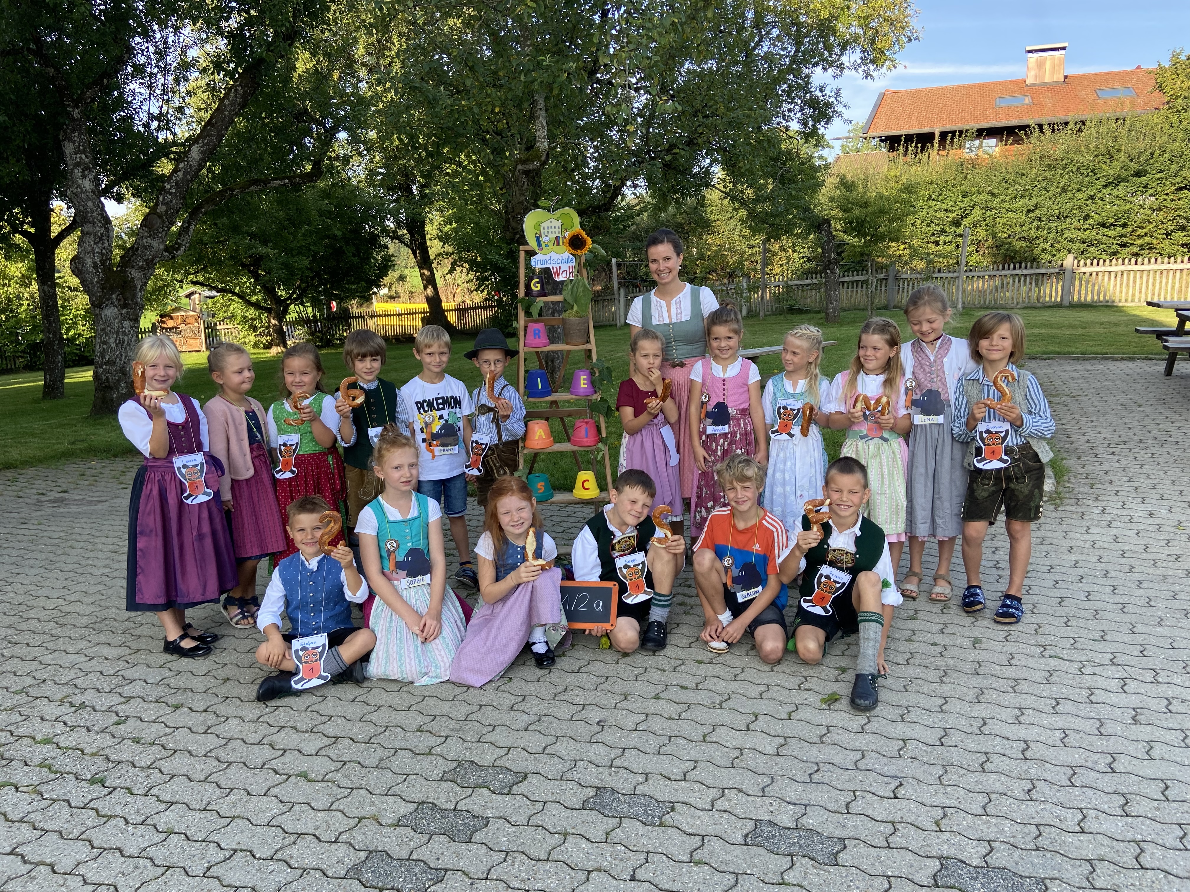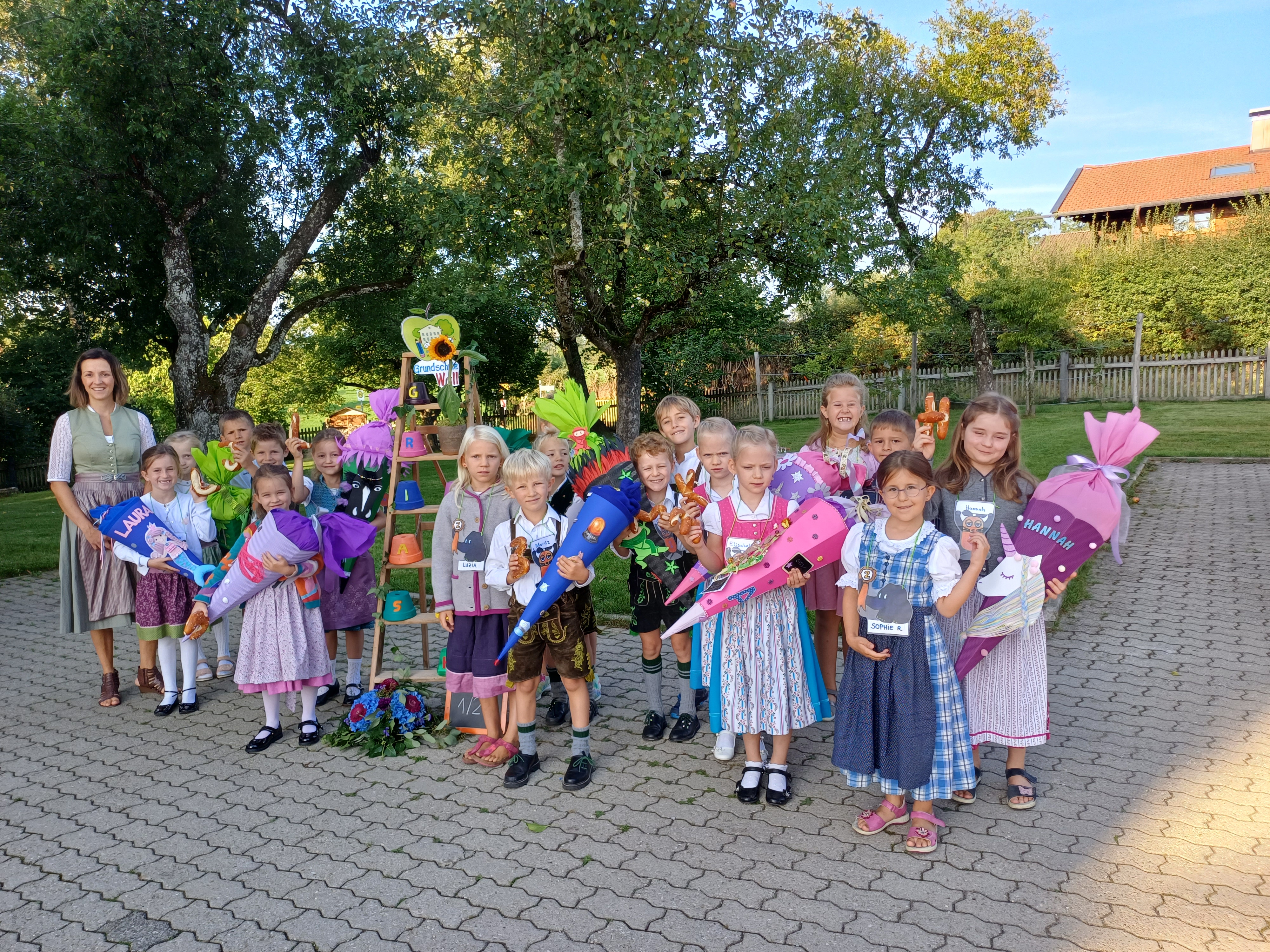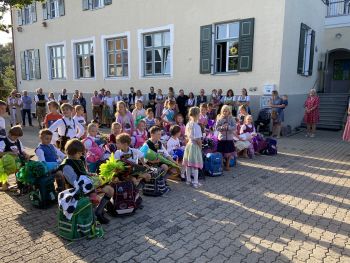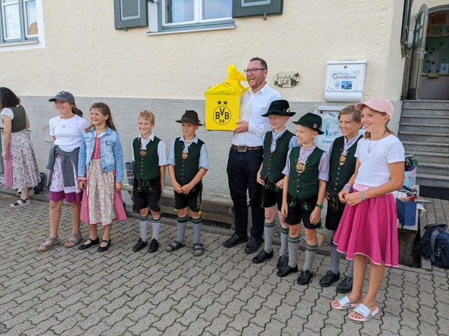Am 12.September 2023 war es endlich soweit, 22 Erstklässler/-innen wurden bei strahlendem Sonnenschein an der Grundschule Wall von Jennifer Staude empfangen und von der ganzen Schulfamilie zu ihrem ersten Schultag begrüßt. Die Kinder der 2. bis 4. Jahrgangsstufe hatten für diesen besonderen Tag das Lied: „Heute ist dein erster Schultag“, vorbereitet und zusammen mit Frau Beck sowie einem Flötenkind vor allen Gästen vorgetragen. Hierbei waren nicht nur unseren Kleinsten sichtbar begeistert. Anschließend ging es für die Schulanfänger/-innen mit ihren Zweitklass-Paten/innen und den jeweiligen Klassenlehrerinnen Marina Beck und Jennifer Staude ins Klassenzimmer, wo erstere ihre Schultüten stolz präsentierten. Die persönlichen Namensbrezen und die Willkommensanhänger für jeden ABC-Schützen erfreuten die Neuankömmlinge sichtlich. Den aufregenden 1. Schultag rundete letztlich ein gemeinsamer Einschulungsgottesdienst für alle Kinder der GS Wall ab. Unter Leitung von Frau Kainz und tatkräftiger Unterstützung von Frau Teufele, erhielten die Kinder der ersten Klassen ihren Segen für das bevorstehende Schuljahr.