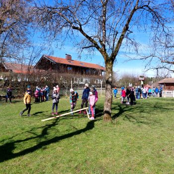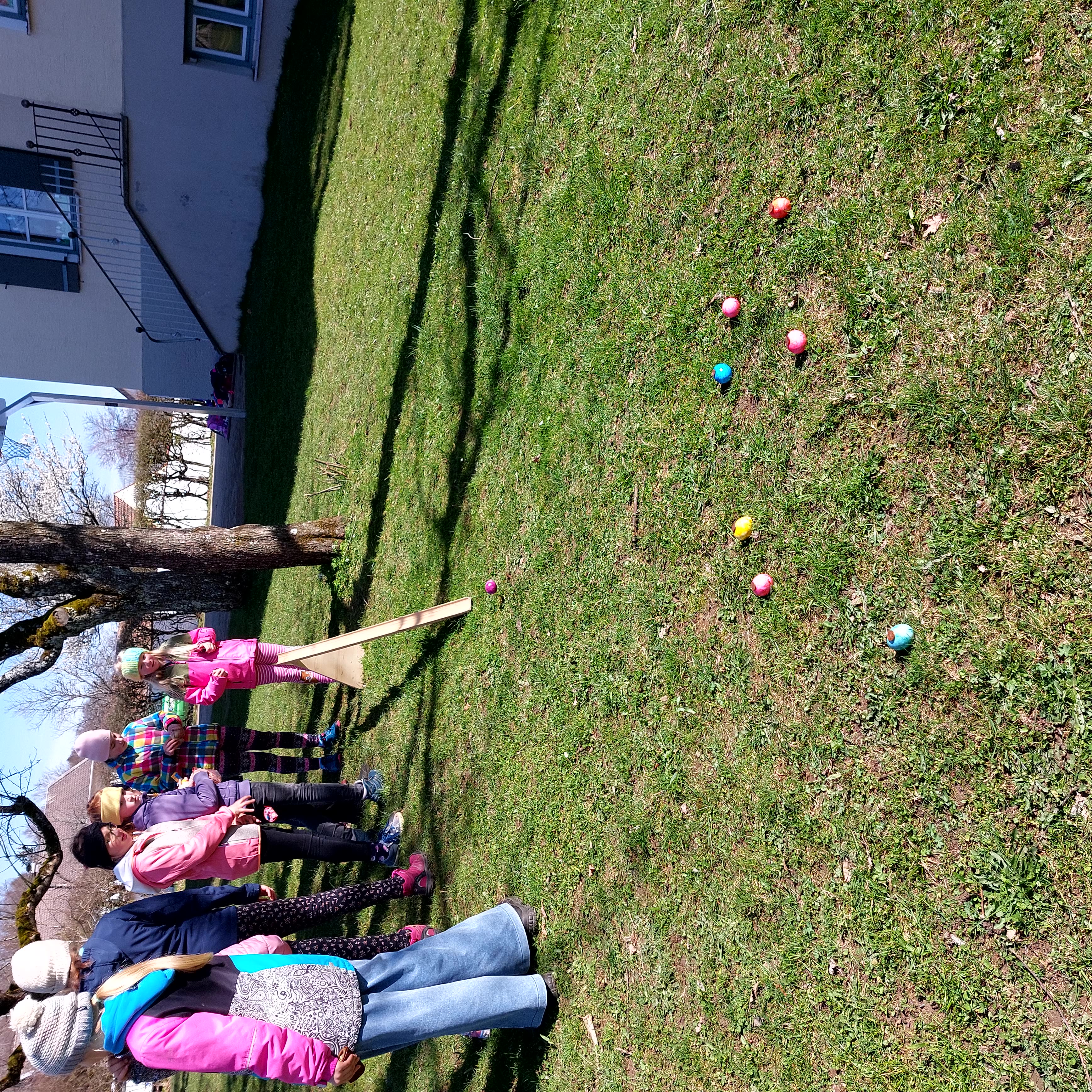 Unterstützt wurden wir vom Elternbeirat, der dem Osterhasen „half“, die hart gekochten Eier spendierte und uns die extra angefertigten "Oarscheim-Holzbahnen" aufbaute. Ein herzliches "Vergelts Gott" dafür!