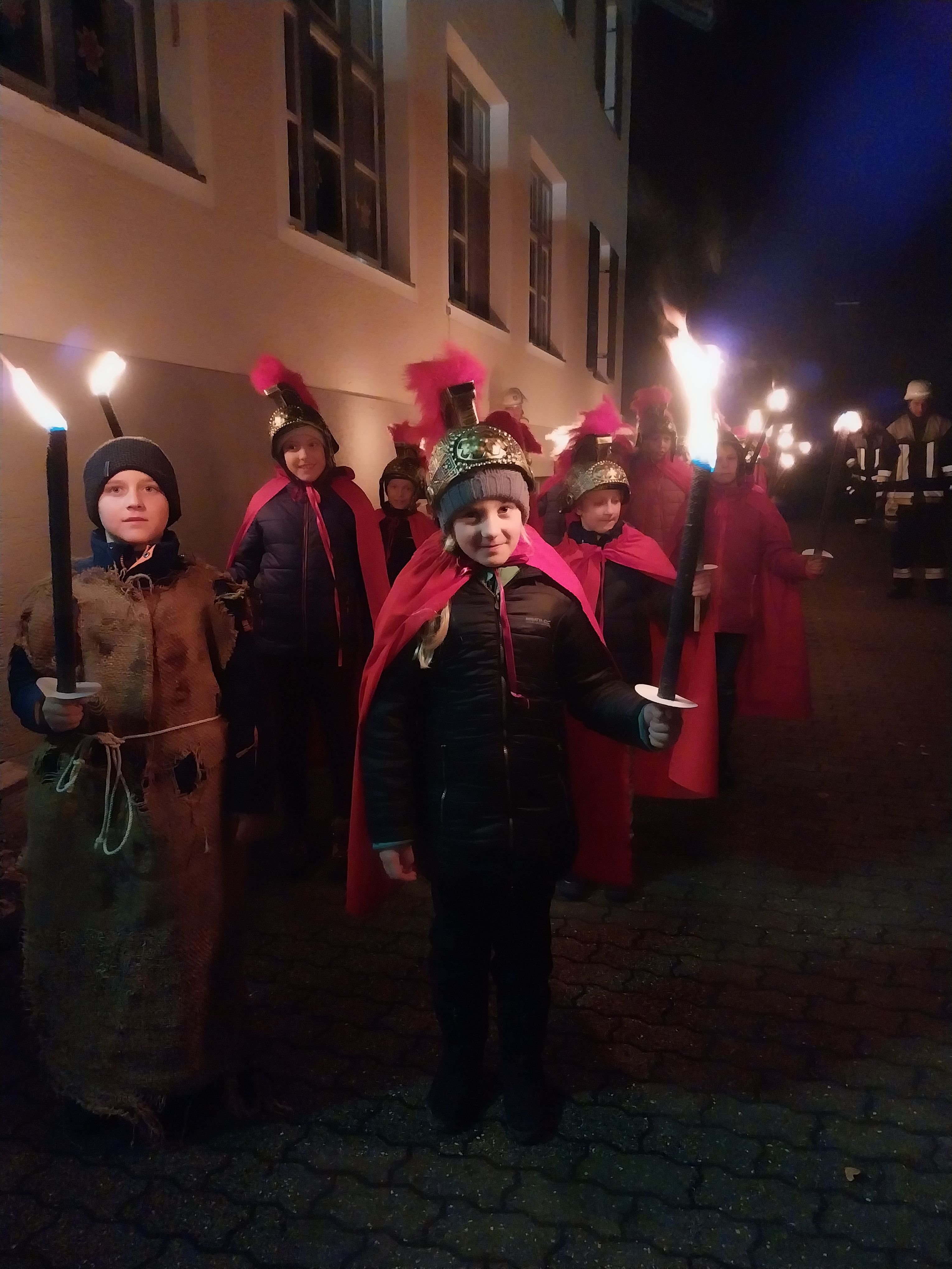 Zum Martinsumzug versammelten sich alle auf dem Pausenhof. Von dort startete der Umzug unter musikalischer Begleitung einiger Waller Musikanten. Vorneweg ritt der Heilige Martin hoch zu Ross, gefolgt von dem Bettler und den Kindern der 3/4a und 3/4b in ihren Soldatengewändern und mit leuchtenden Fackeln.