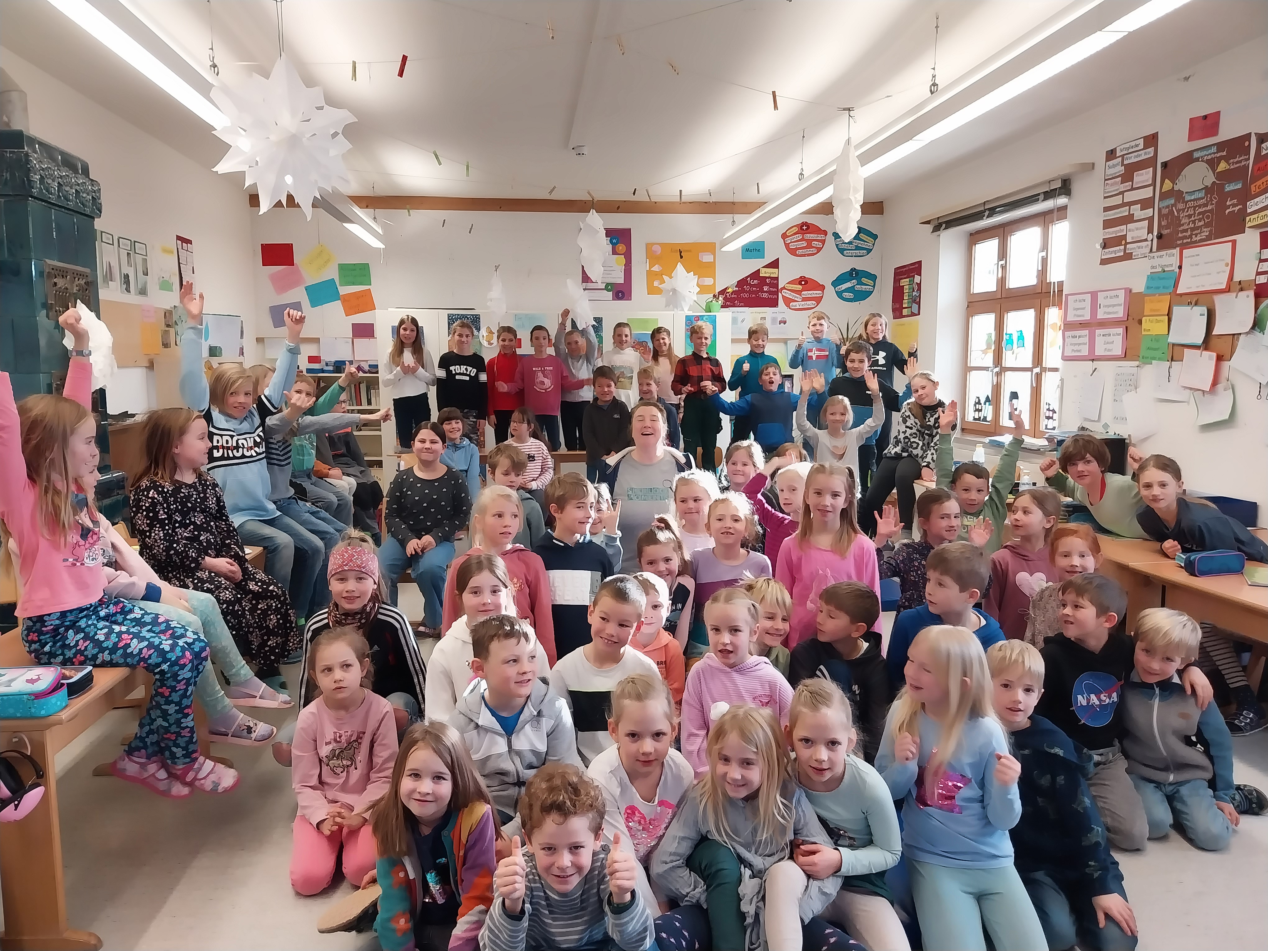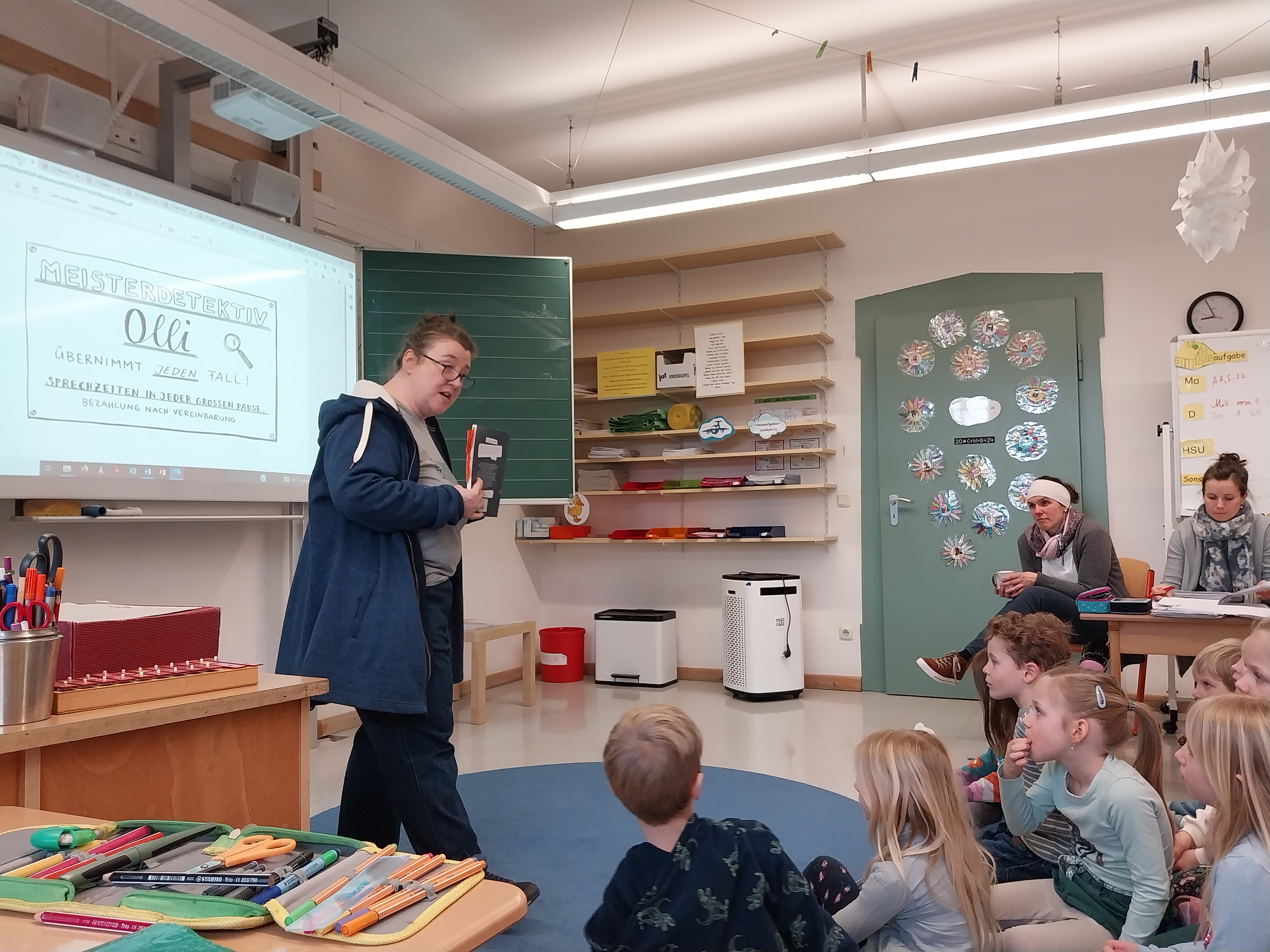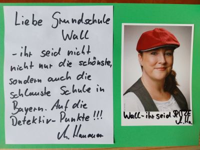 Am Donnerstag, 08.02.24 besuchte uns die Kinder- und Jugendbuchautorin, Michaela Hanauer und riss die Kinder mit einer spannenden Mitmach-Detektiv Lesung mit. Die Autorin von ca.60 Büchern las aus ihrem 2016 erschienenen Buch „Löse den Fall“ vor und lies die Schüler/innen ständig miträtseln, indem sie u.a. eine Geheimschrift in Spiegelschrift entziffern mussten oder den Weg ins Baumhaus herausfinden sollten. Für die fleißigen Detektive gab es für gelöste Aufgaben Detektivpunkte auf dem Handrücken notiert als Belohnung.