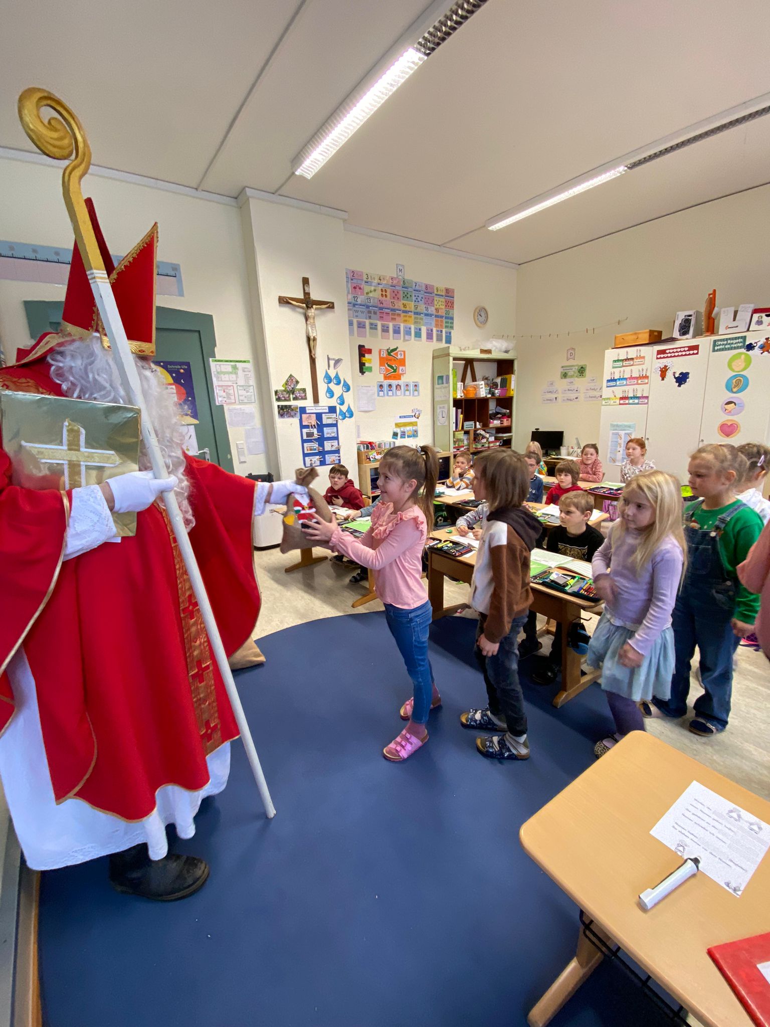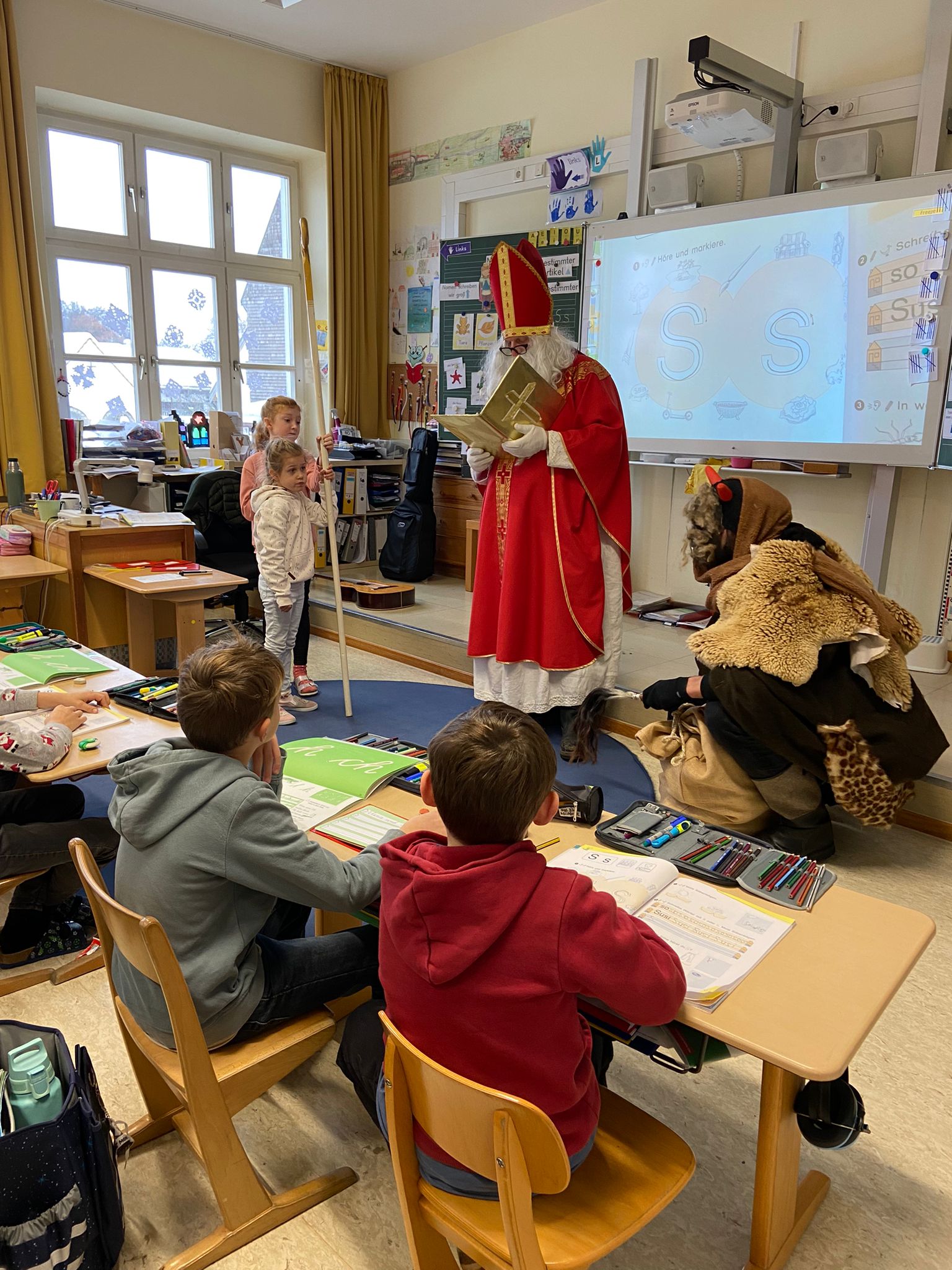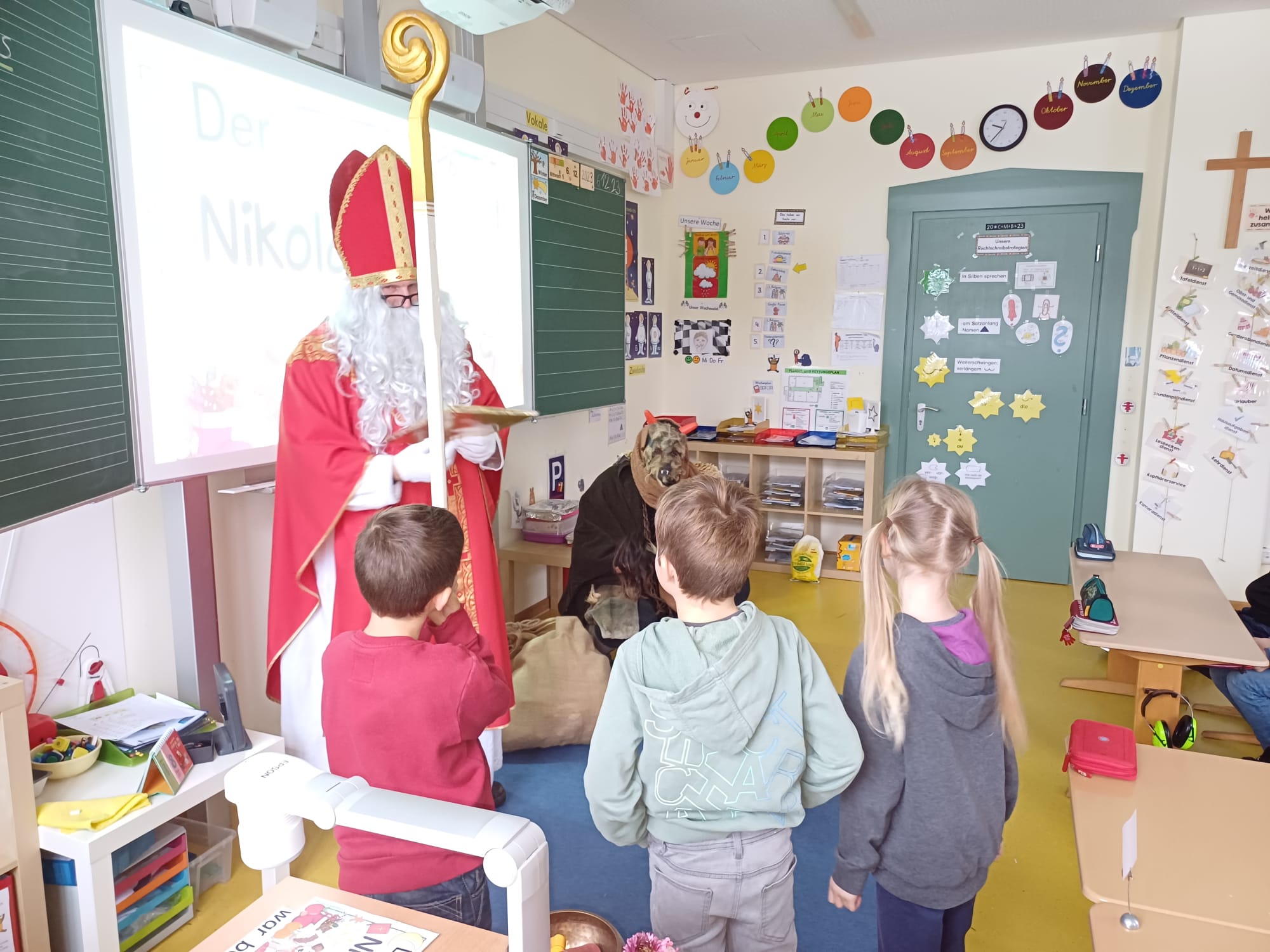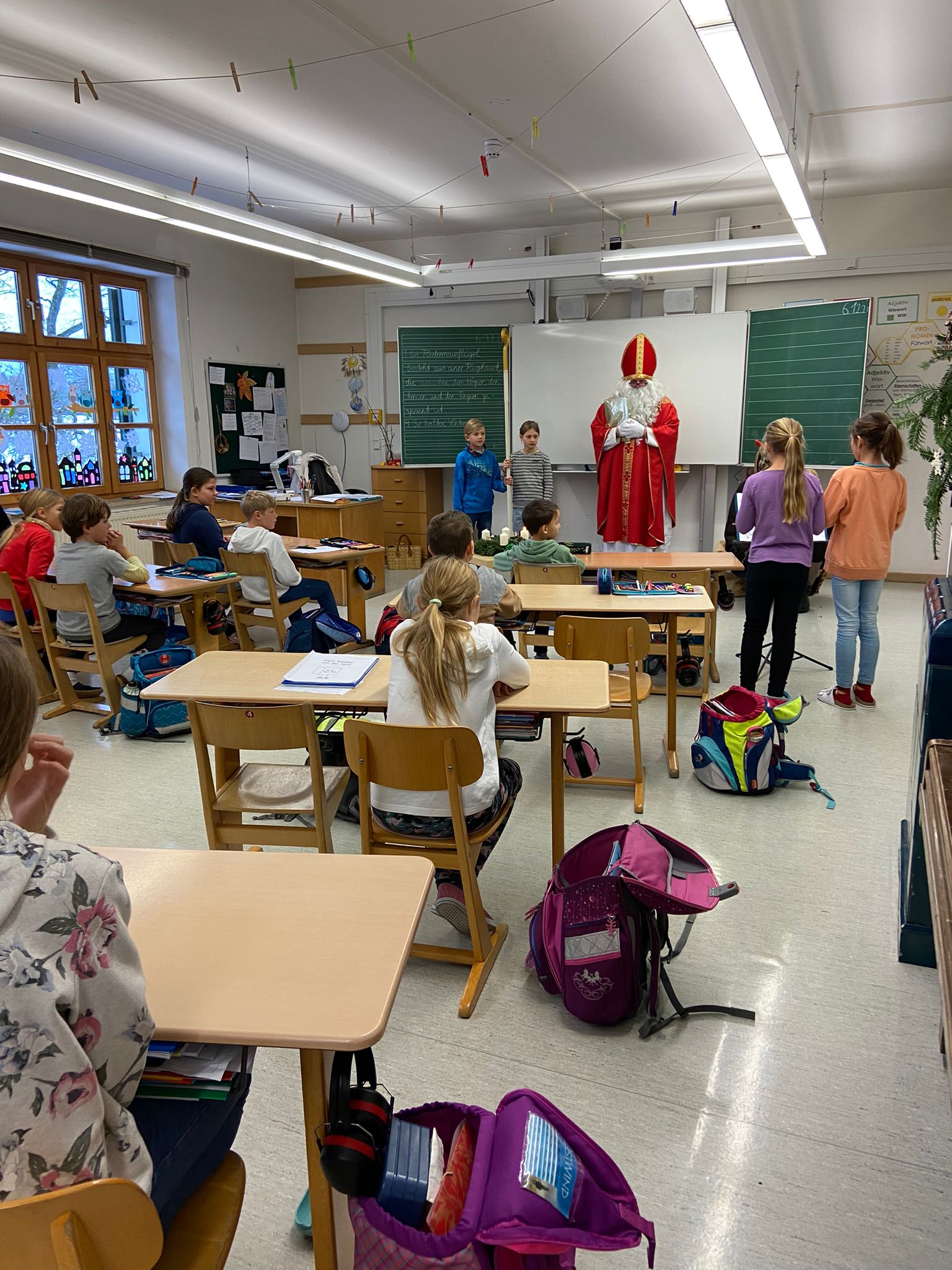 Auch dieses Schuljahr besuchte der Heilige Nikolaus am 6.12.23 alle 4 Klassen der Grundschule Wall. Mit gemischten Gefühlen und großer Spannung hörten die Kinder genau zu, was der Nikolaus aus seinem goldenen Buch vorlas. Dabei gab es viel Lob, auch Verbesserungswürdiges kam zu Tage. Besonders freute er sich über die zahlreichen, kleinen Beiträge der Kinder in Form von Gedichten, Liedern oder Instrumentalstücken. Zum Abschied bekam jedes Kind ein reich gefülltes Sackerl vom Nikolaus mit auf den Weg. An dieser Stelle ein herzliches Dankeschön an den Nikolaus und den fleißigen Helferinnen des Elternbeirats.