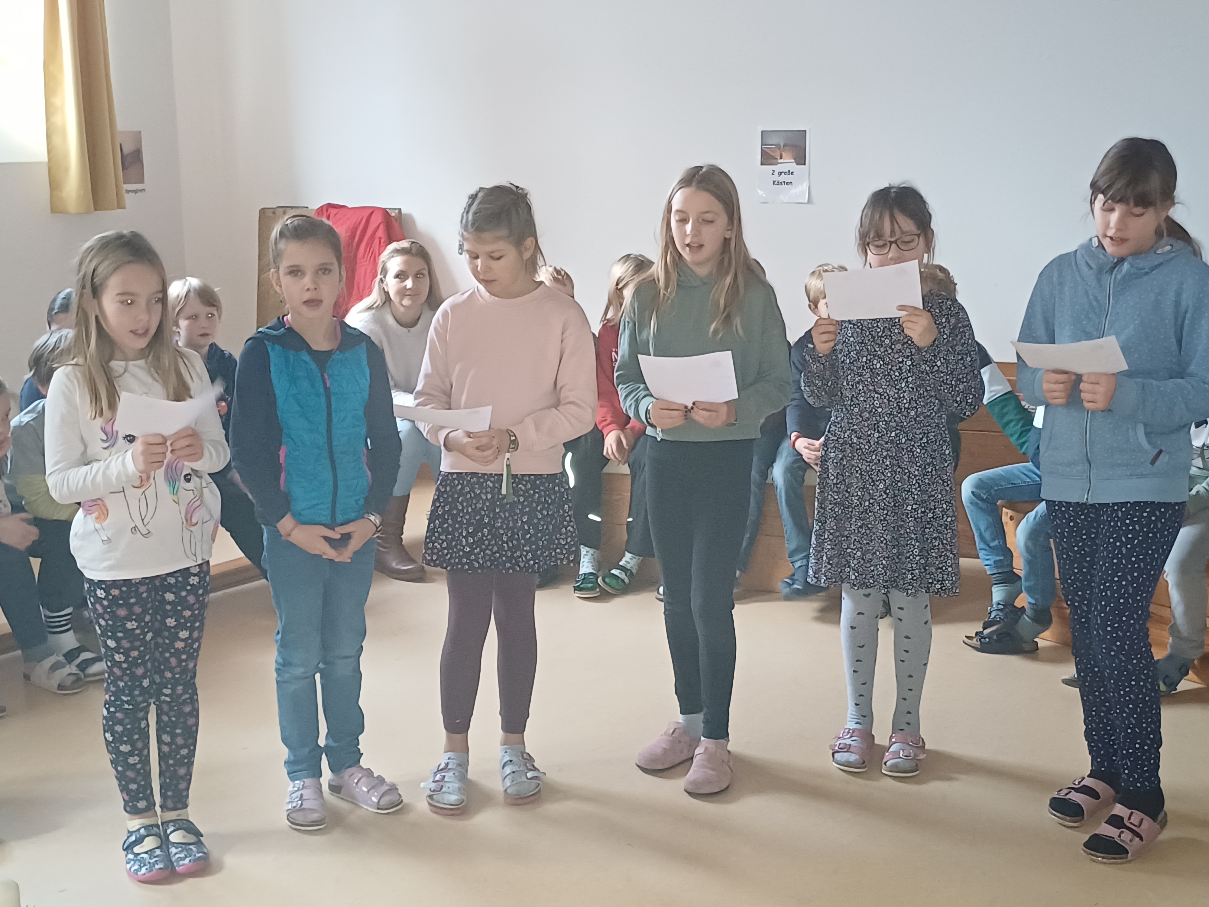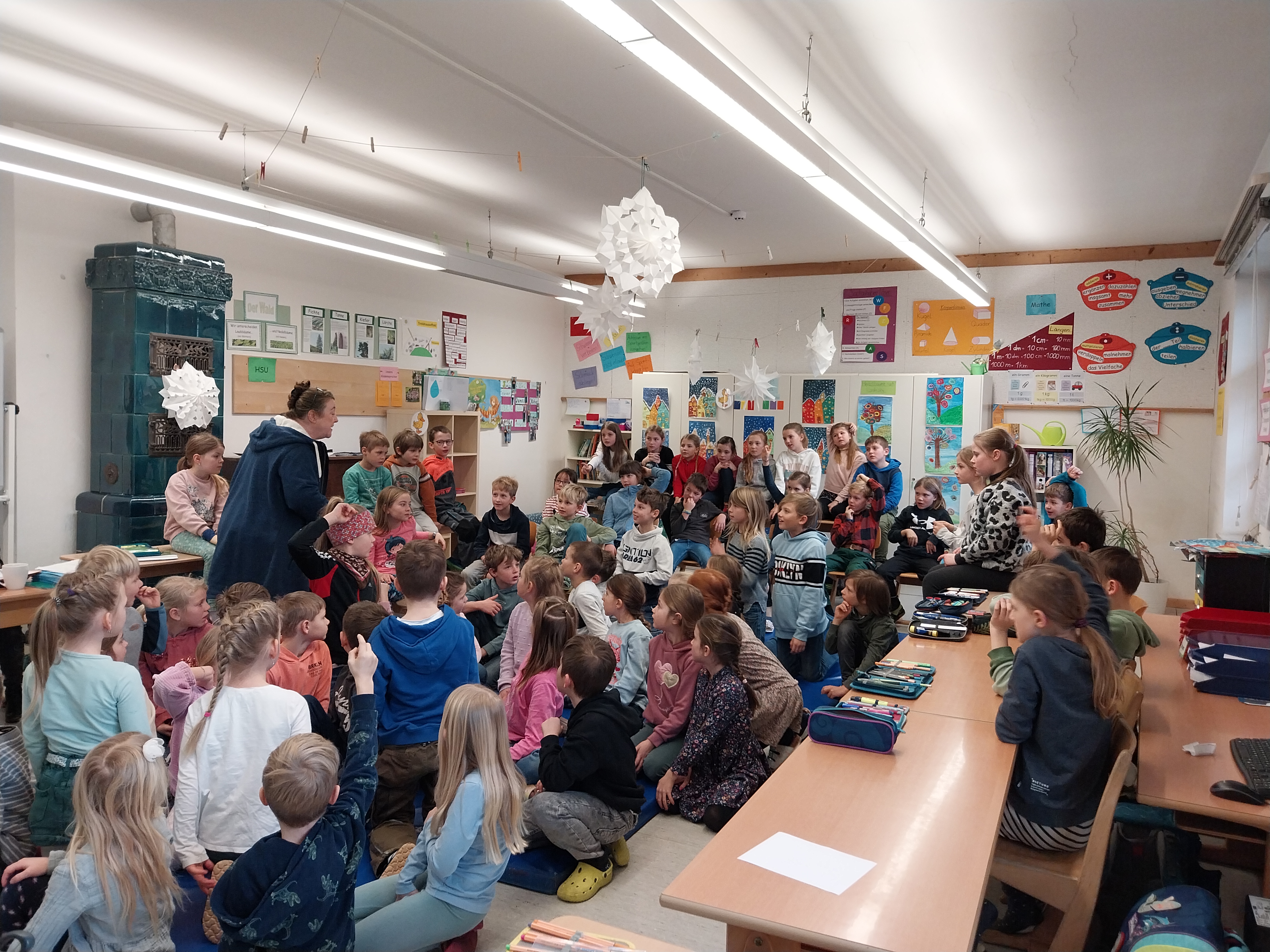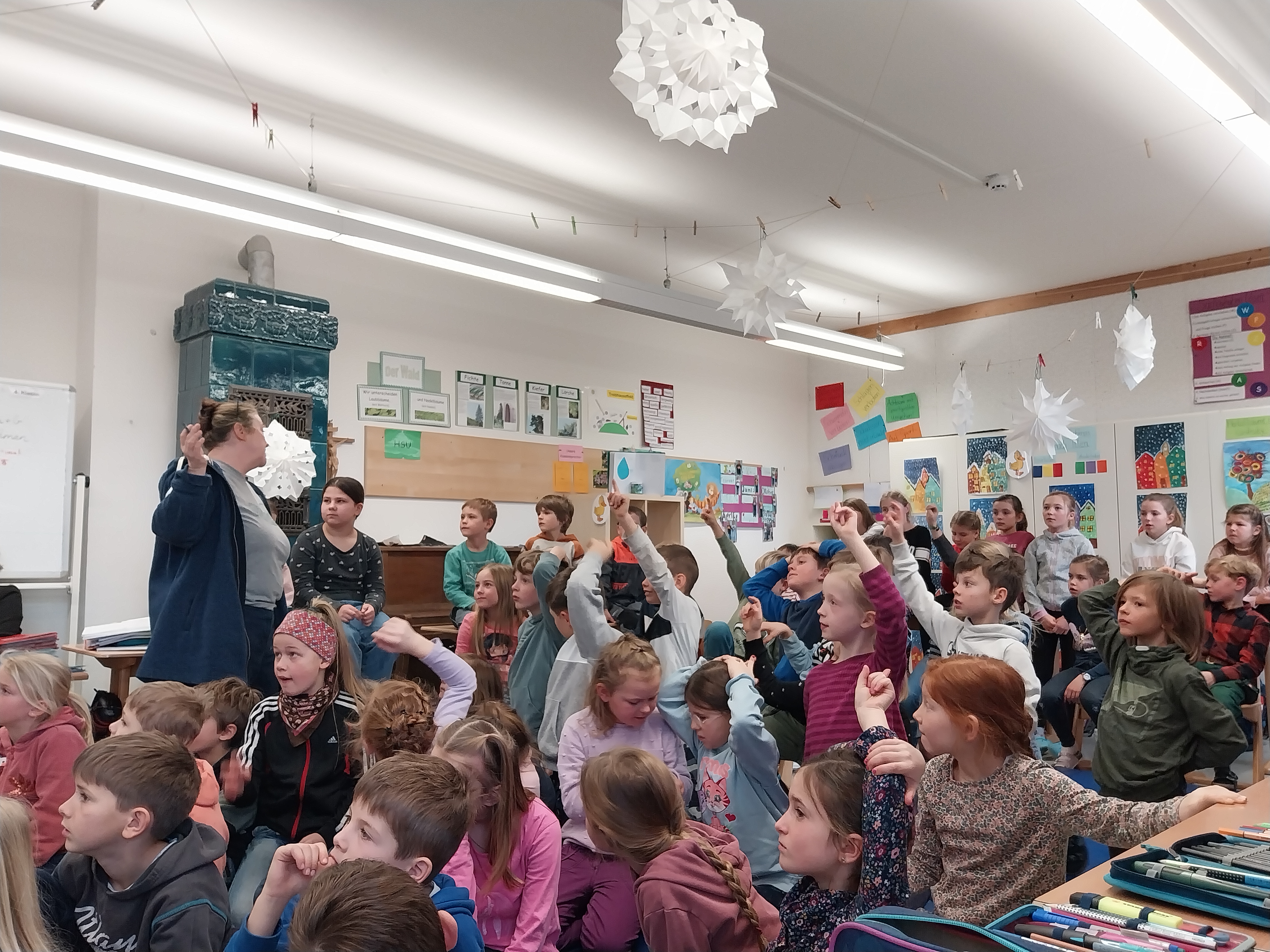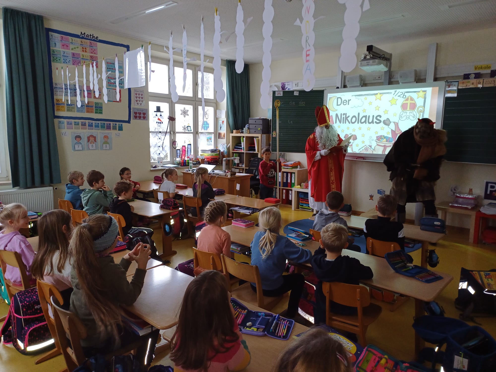 Auch dieses Schuljahr besuchte der Heilige Nikolaus am 6.12.23 alle 4 Klassen der Grundschule Wall. Mit gemischten Gefühlen und großer Spannung hörten die Kinder genau zu, was der Nikolaus aus seinem goldenen Buch vorlas. Dabei gab es viel Lob, auch Verbesserungswürdiges kam zu Tage. Besonders freute er sich über die zahlreichen, kleinen Beiträge der Kinder in Form von Gedichten, Liedern oder Instrumentalstücken. Zum Abschied bekam jedes Kind ein reich gefülltes Sackerl vom Nikolaus mit auf den Weg. An dieser Stelle ein herzliches Dankeschön an den Nikolaus und den fleißigen Helferinnen des Elternbeirats.