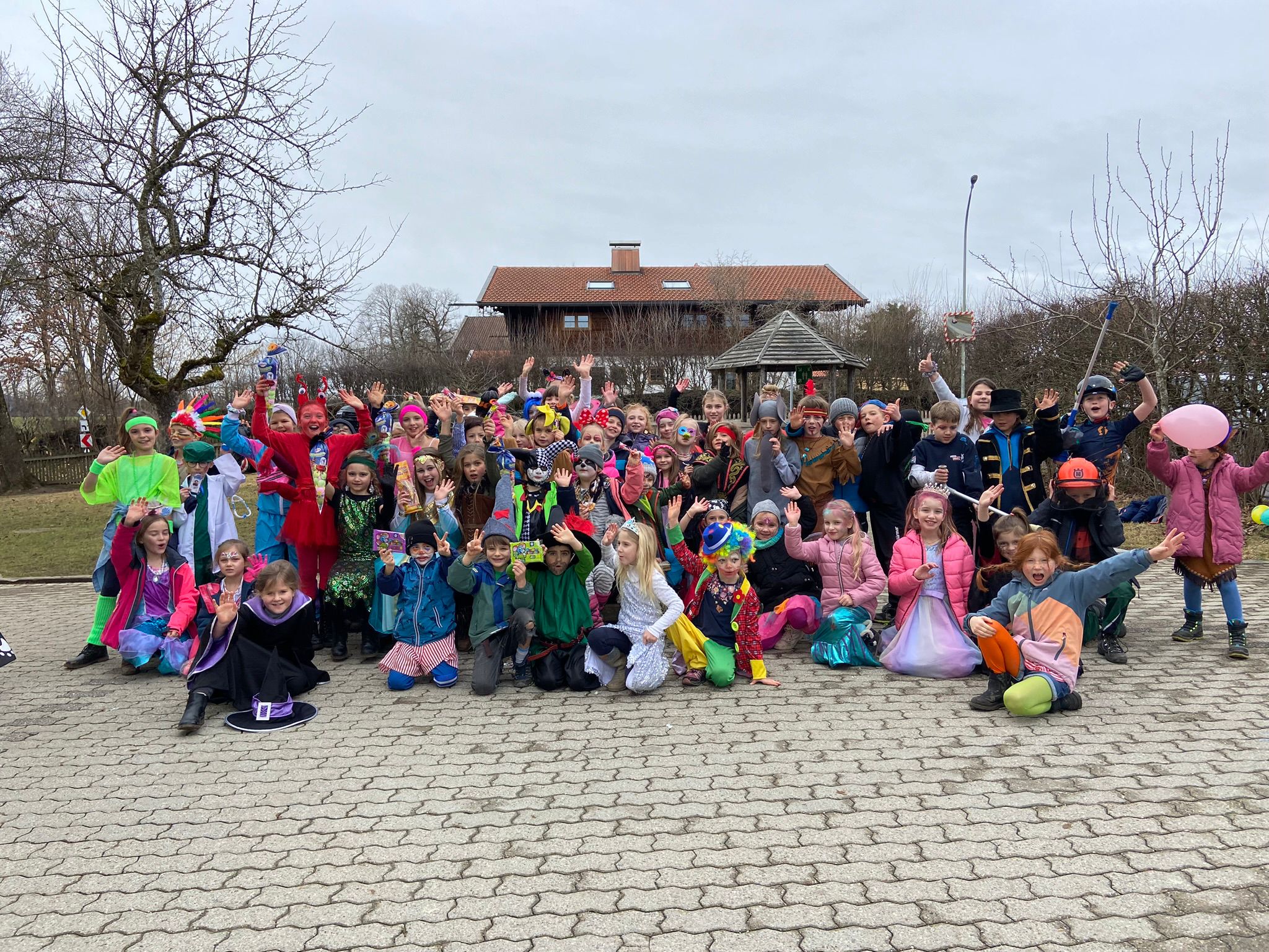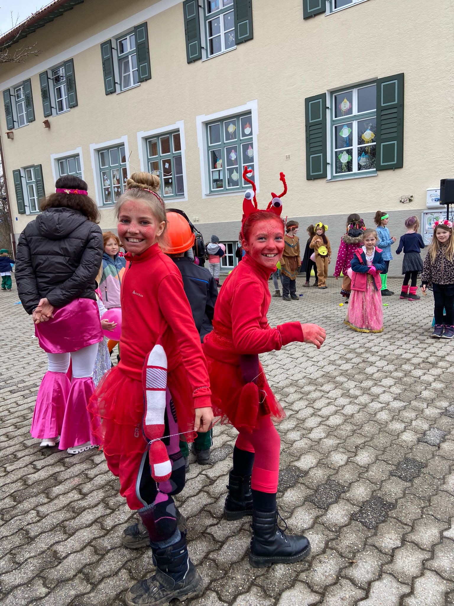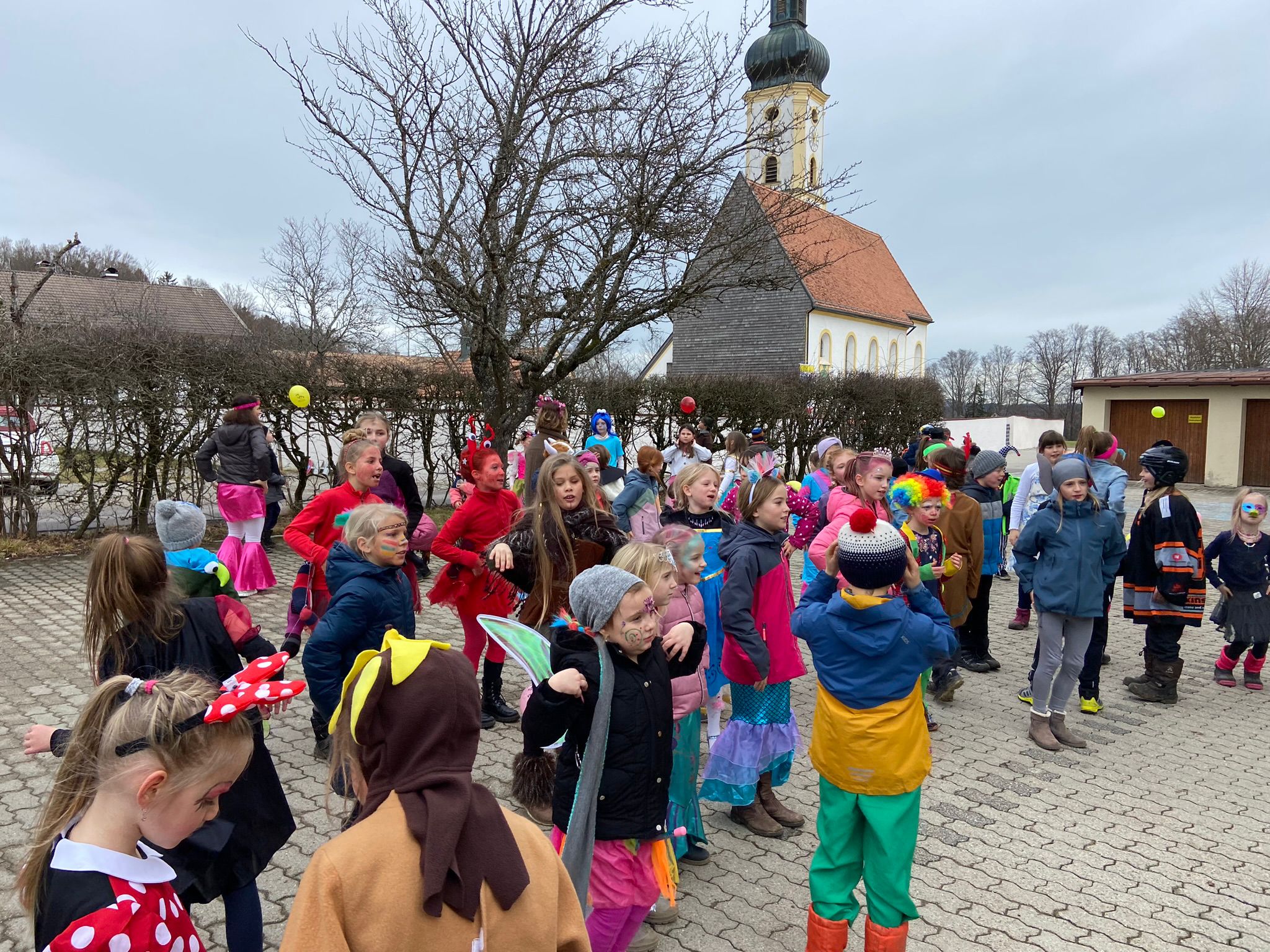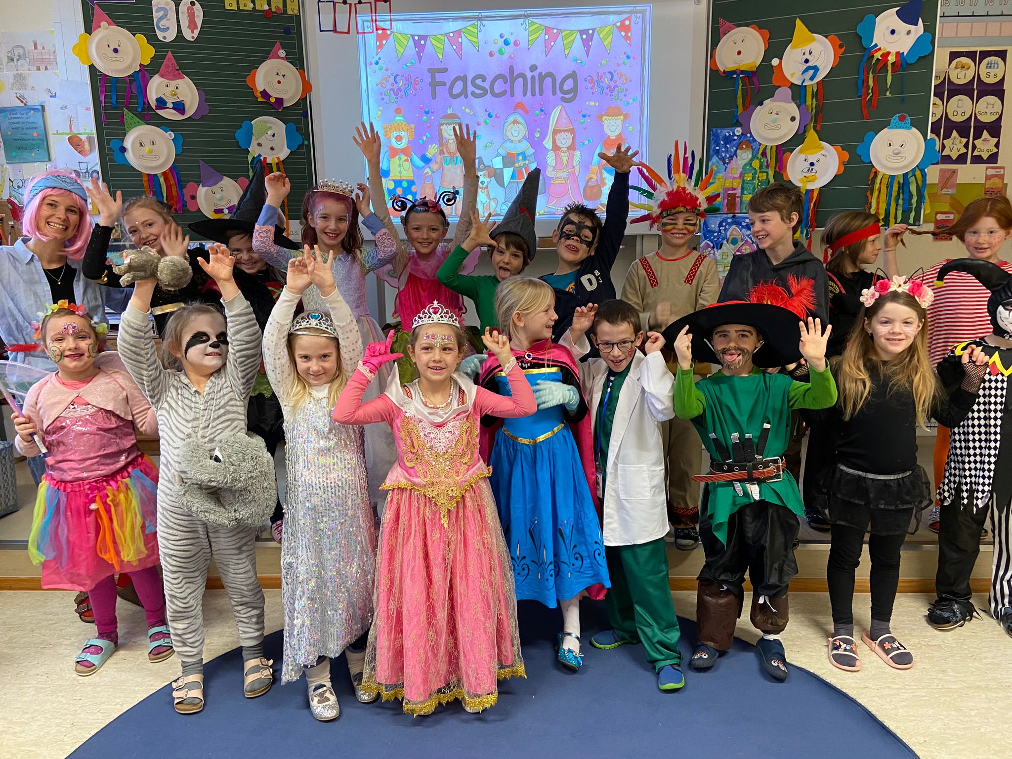 Nach zwei Stunden fleißigem Pauken, wobei auch die Unterrichtsinhalte an diesem Tag alle das Thema Fasching aufgriffen, wurde unsere Maschgaraparty mit passender Musik und leckeren Krapfen eingeläutet. Nachdem uns die Kindergartenkinder am unsinnigen Donnerstag einen Besuch abstatteten, besuchten die Schüler*innen der ersten und zweiten Klassen zunächst die Hauskinder und luden sie nach einer gemeinsamen Bolognese durch den Kindergarten zu uns auf den Schulhof ein. Dort verbrauchten wir allesamt die Pause und tanzten vergnügt zur Faschingsmusik. Als die kleinen Clowns, Tierkostüme, Indianer*innen usw. wieder zurück in den Kindergarten marschierten, folgte das Highlight unseres Faschingstages: Eine Kinderdisco mit toller Musik, Tanz, vielen lustigen Spielen und köstlichen Leckereien!!! Abschließend wurden sogar noch die einfallsreichsten Klassenkostüme geehrt sowie gefeiert.