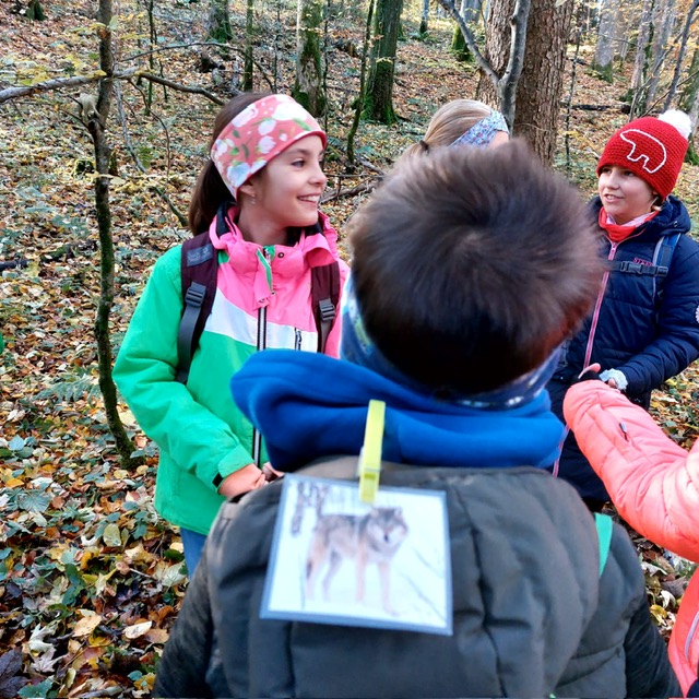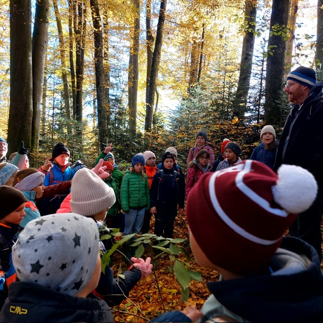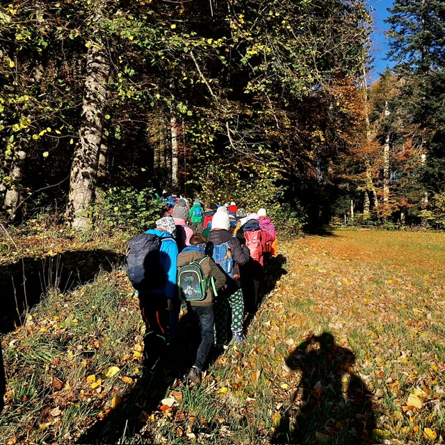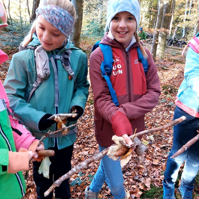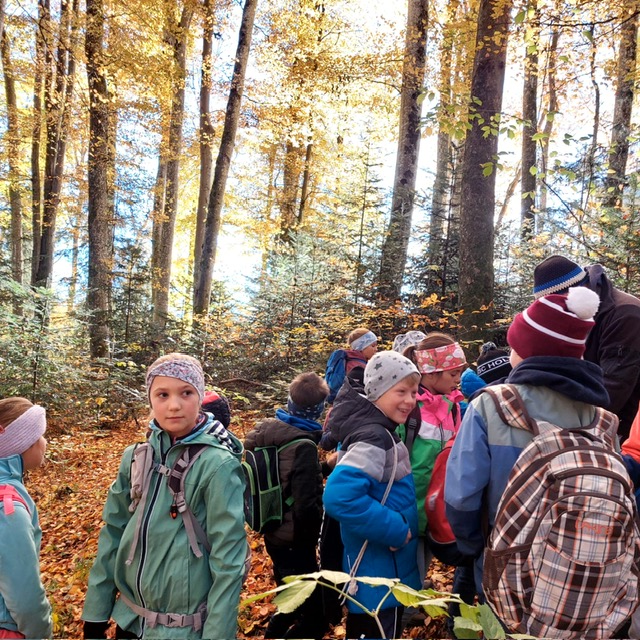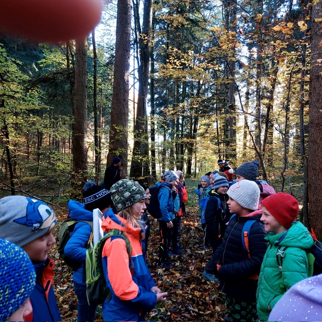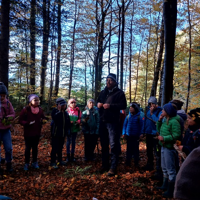Wie könnte der Schulstart nach den Herbstferien besser beginnen wie mit einem Unterrichtsgang in den Wald. Bei schönem Herbstwetter begleitete uns der Förster Herr Feist vom Forstrevier Miesbach in den Wald. Dort durften die Dritt- und Viertklässler/innen mit allen Sinnen den Wald erfahren und ihre offenen Fragen an den Fachmann richten, nachdem wir uns in den letzten Wochen mit dem Thema „Wald“ intensiv beschäftigt haben. Wie versteckt ein Eichhörnchen seine Nüsse? Wie erkenne ich das Alter einer Fichte? Was ist der Unterschied zwischen einem Waldkauz und einer Waldohreule? Die Antwort auf diese Fragen und vieles mehr brachte Herr Feist den Kindern spielerisch und anschaulich bei. Die Zeit verging beim Tierratespiel „Wer bin ich“ oder beim „Waldgegenstände- Memory“ wie im Flug und bereitete den Kindern große Freude.
