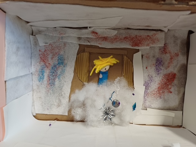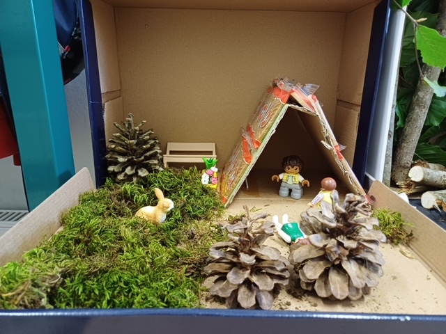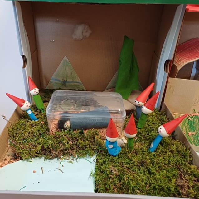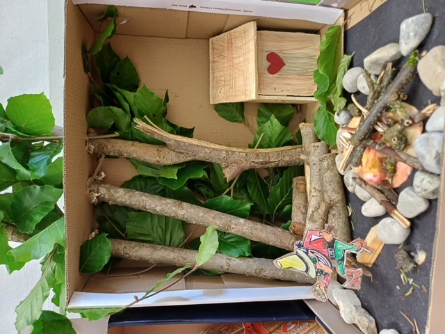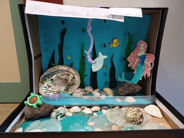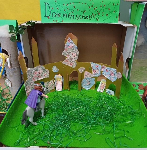 Die Klassen 1/2a und 1/2b tauchten für einige Wochen in die Welt der Märchen ab. Auf unterschiedliche Weise setzten wir uns mit den schönen Geschichten der Gebrüder Grimm auseinander. Als Abschluss und Hohepunkt unserer Sequenz durfte jedes Kind ein Märchen im Schuhkarton gestalten. Dafür musste es sich zuvor eine Szene aus einem Märchen aussuchen, welches ihm besonders gefallen hat. Nachdem alle Schülerinnen und Schüler in den Pfingstferien fleißig Material hierfür gesammelt haben, machten wir uns in der Schule gemeinsam ans Werk.