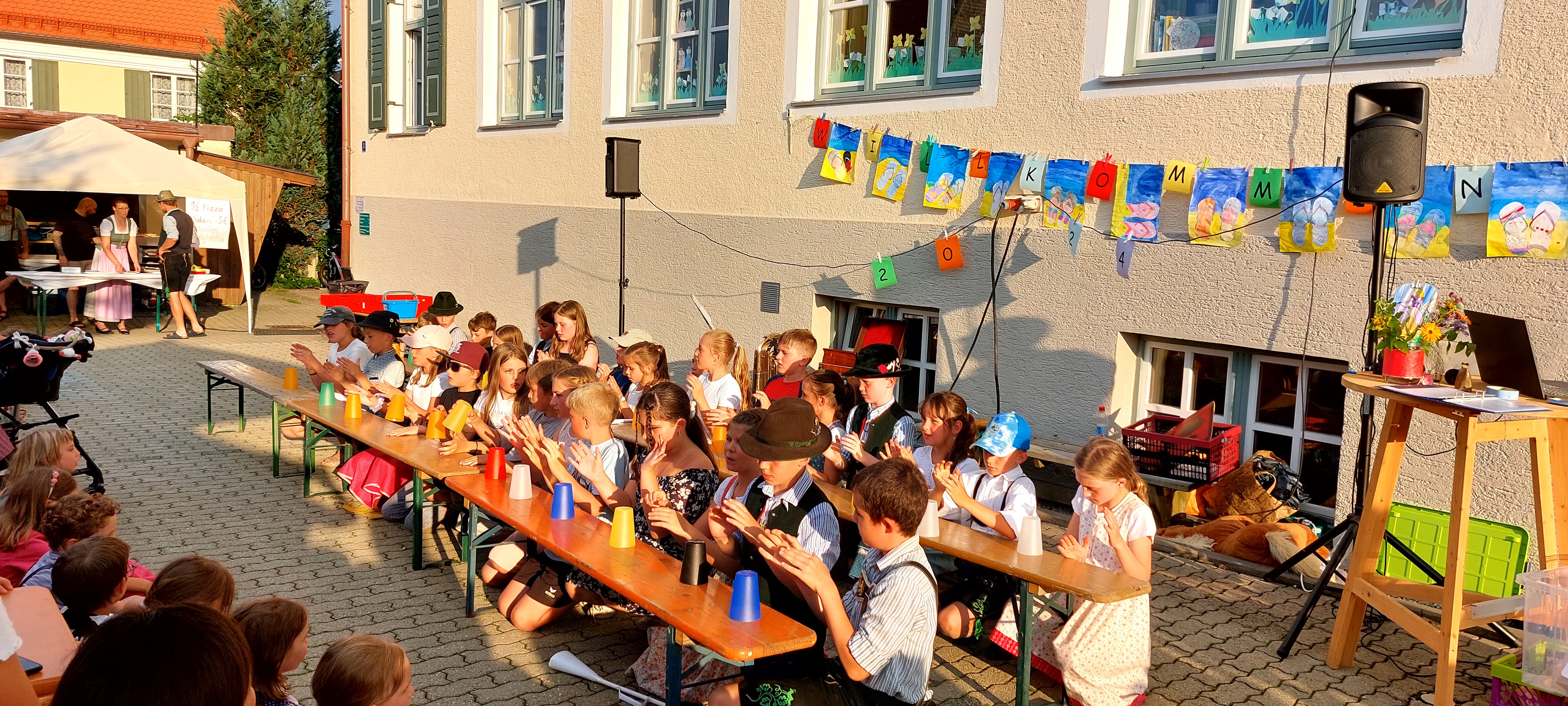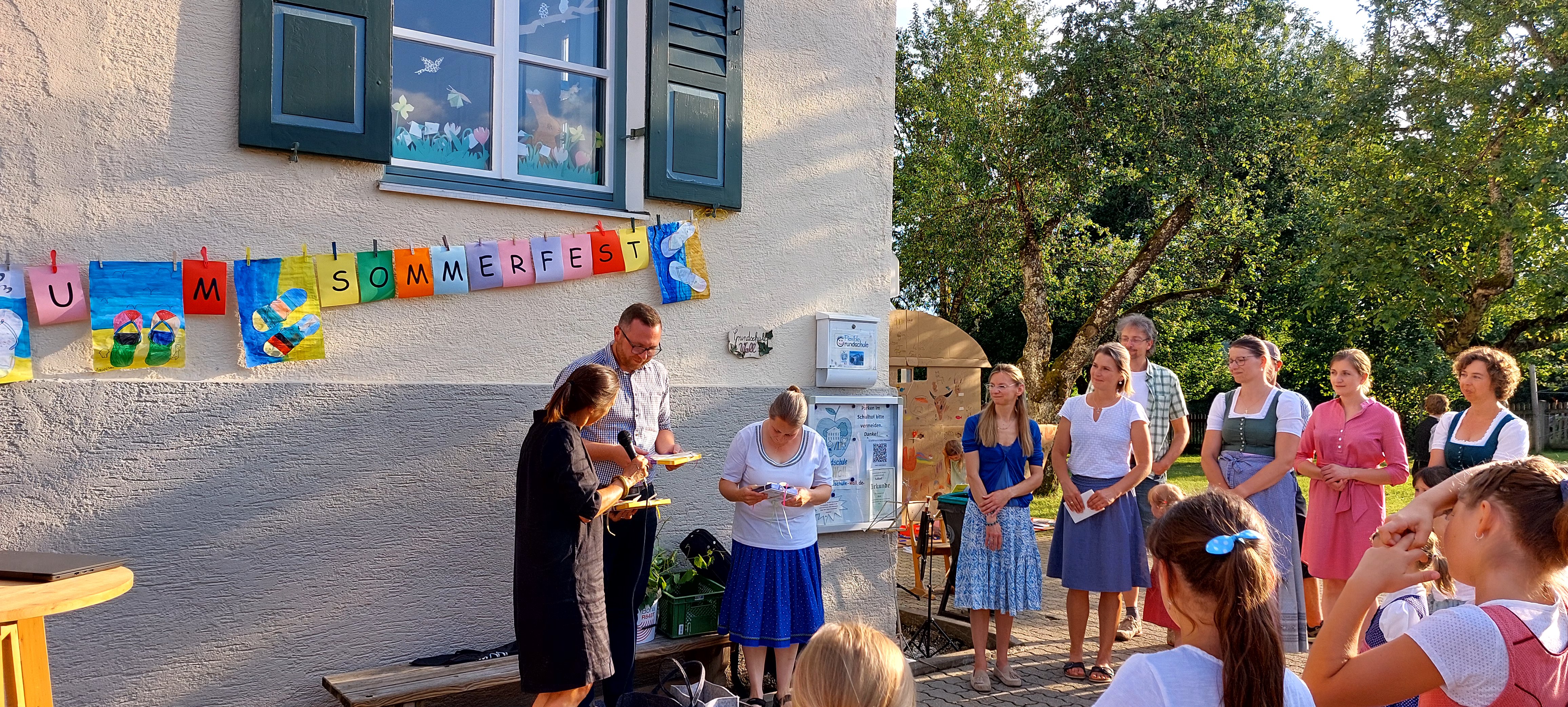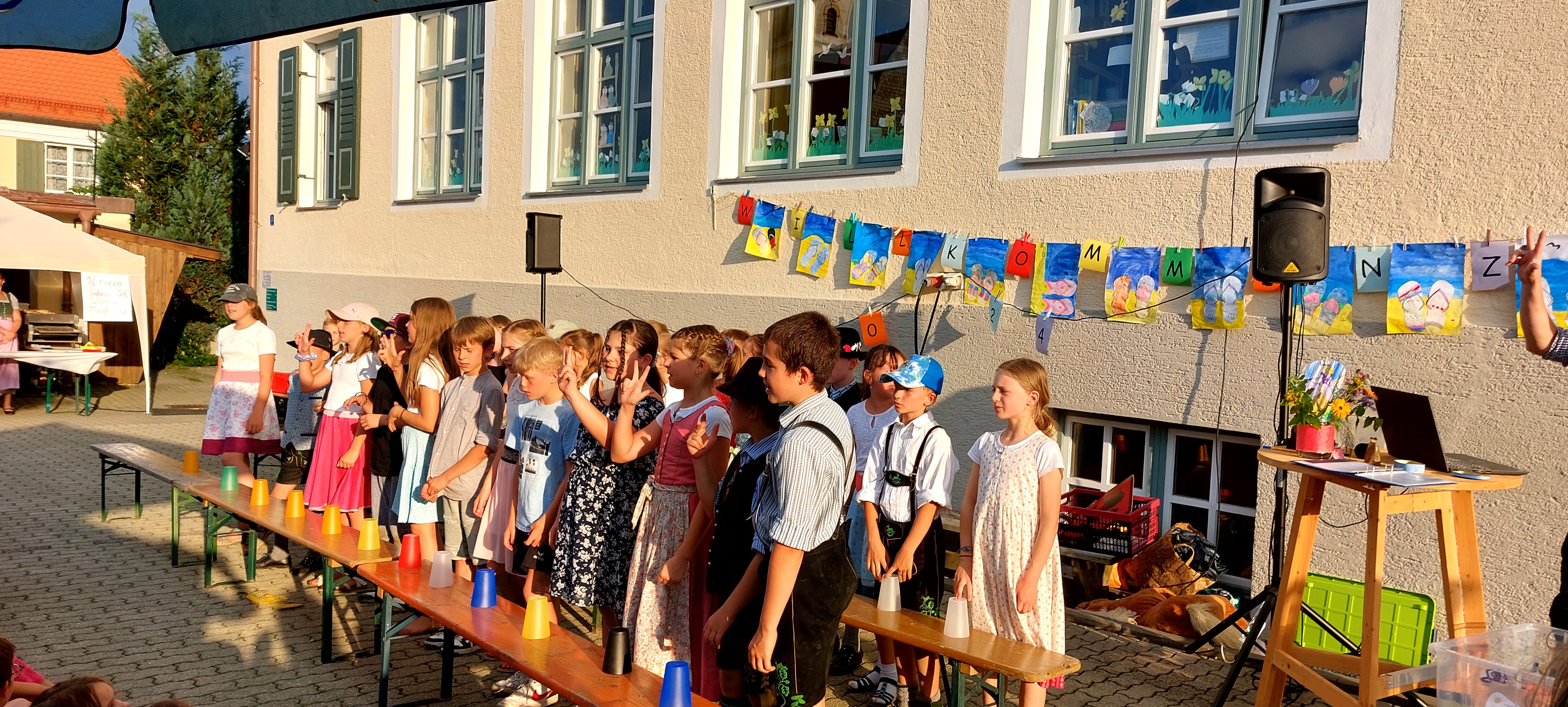 Dankesworte von Frau Ledermann (stellvertretende Schulleitung) an alle fleißigen Helfer und Helferinnen, die unsere schulische Arbeit in diesem Schuljahr tatkräftig unterstützten, folgten mit kleinen Dankesgeschenken. Überrascht wurde die Lehrerschaft vom Elternbeirat, als es hieß, "Bitte Antreten zum Theaterstück". Spontan durften alle Lehrkräfte in eine Märchenrolle schlüpfen, sich verkleiden und ein heiteres Prinzentheater, sehr zur Freude der Zuschauer, vorführen. Die dritten und vierten Klassen rundeten das freudige Programm mit einem einstudierten Cupsong zu dem Lied „Sowieso von Mark Forster“ ab und begeisterten das Publikum zum Mitsingen sowie Klatschen. Für das leibliche Wohl sorgte wie immer der Elternbeirat, welcher uns mit selbstgemachter Pizza, Kuchen, Eis und Getränken verwöhnte, so dass das Sommerfest in gemütlicher Runde ausklingen konnte.