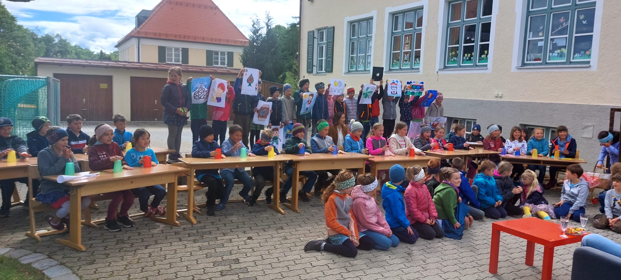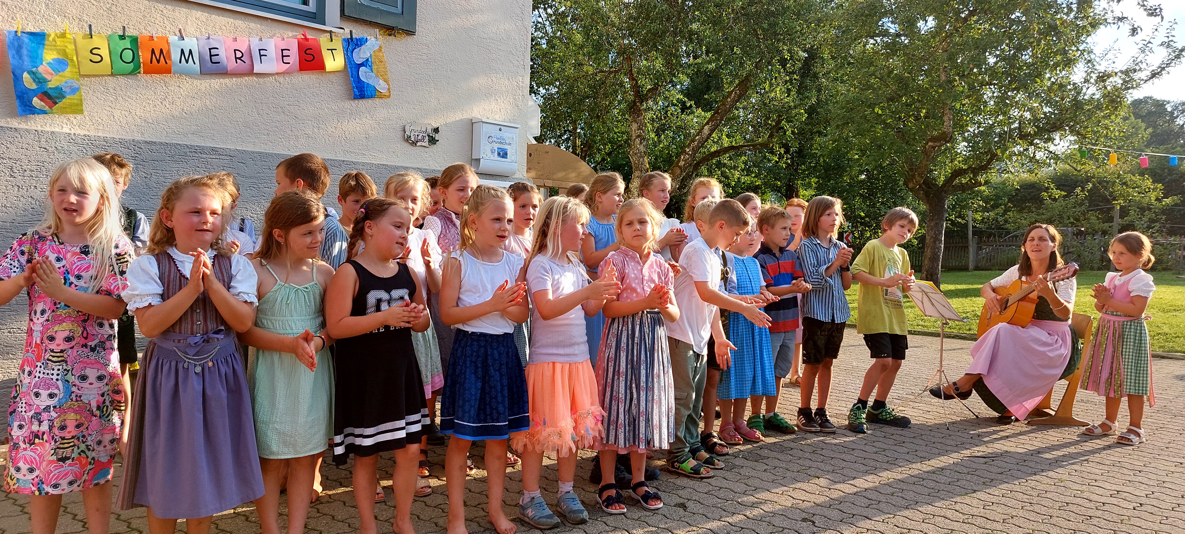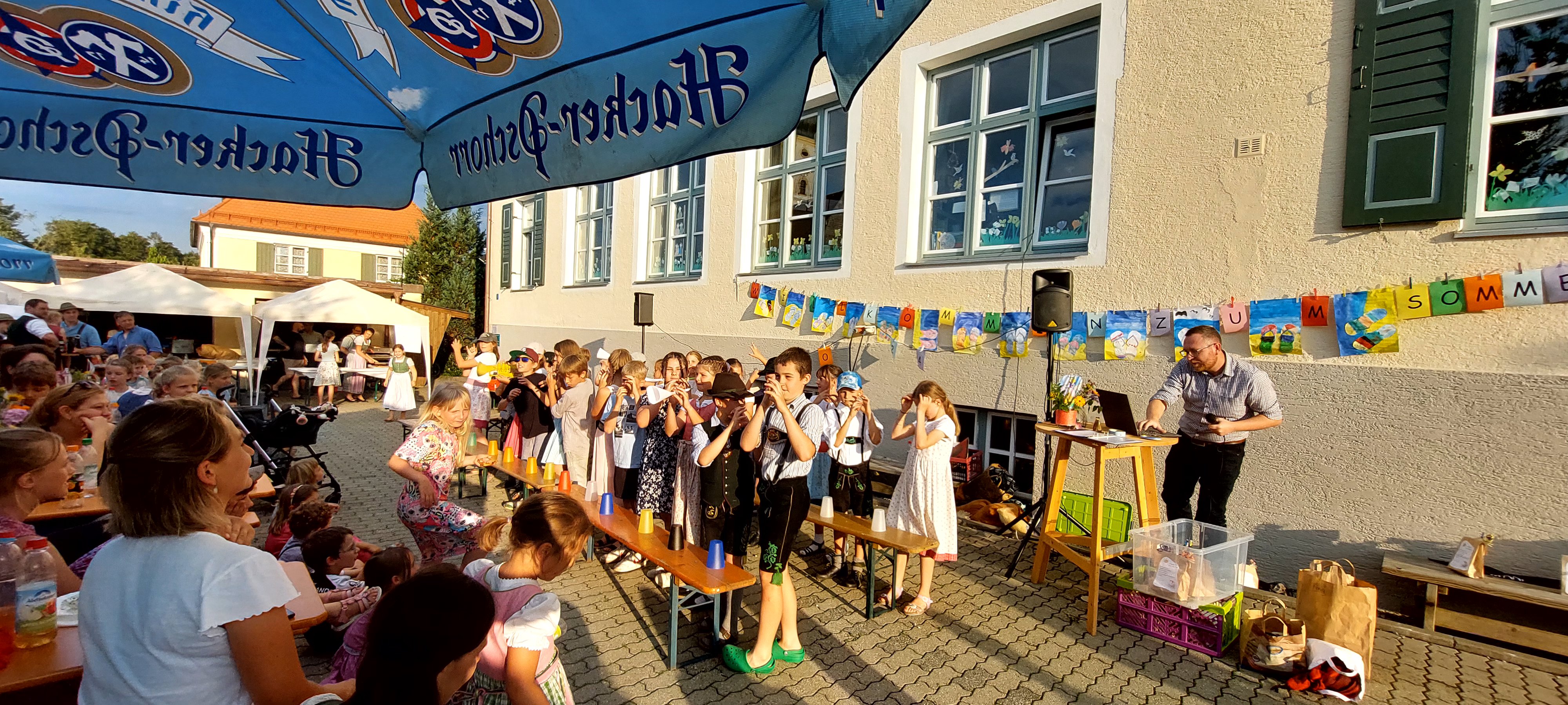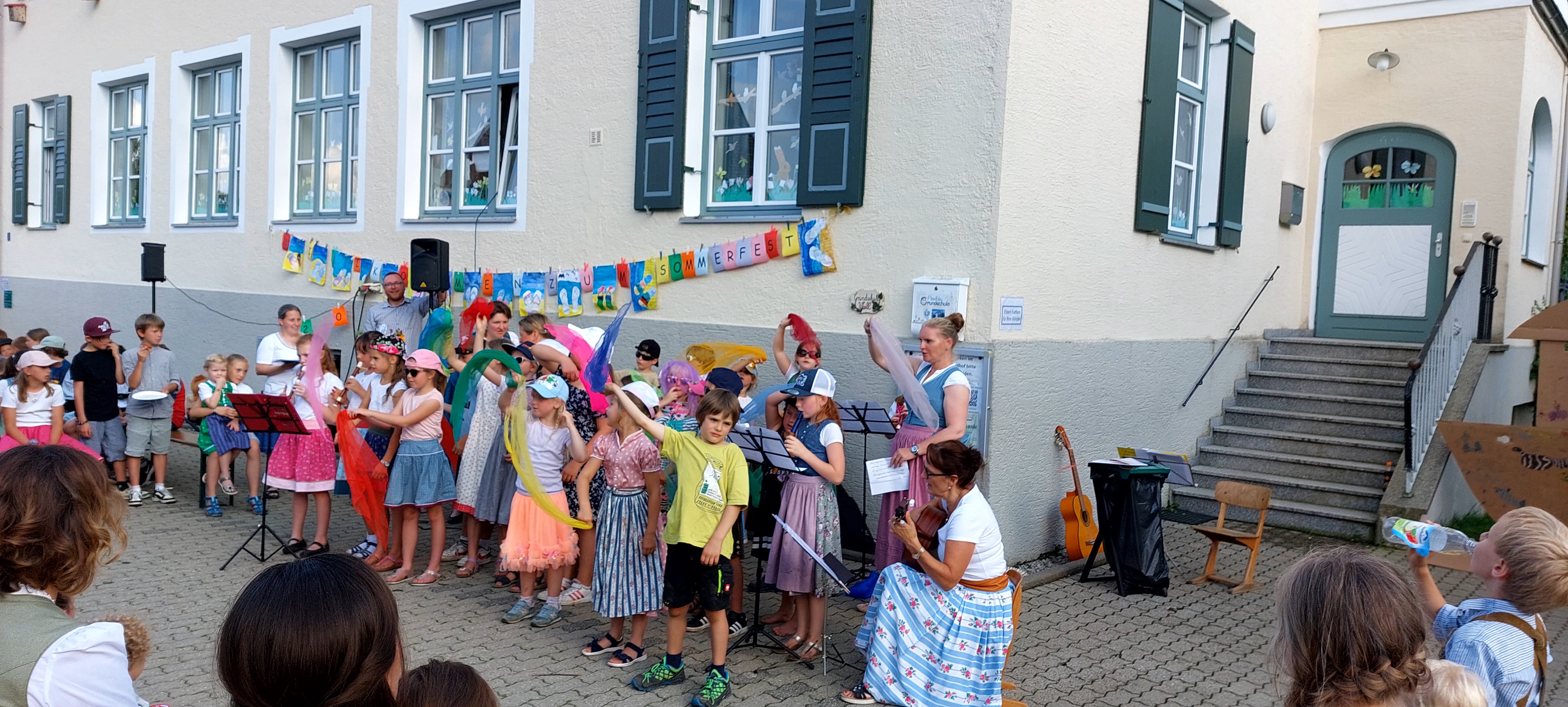 Dankesworte von Frau Ledermann (stellvertretende Schulleitung) an alle fleißigen Helfer und Helferinnen, die unsere schulische Arbeit in diesem Schuljahr tatkräftig unterstützten, folgten mit kleinen Dankesgeschenken. Überrascht wurde die Lehrerschaft vom Elternbeirat, als es hieß, "Bitte Antreten zum Theaterstück". Spontan durften alle Lehrkräfte in eine Märchenrolle schlüpfen, sich verkleiden und ein heiteres Prinzentheater, sehr zur Freude der Zuschauer, vorführen. Die dritten und vierten Klassen rundeten das freudige Programm mit einem einstudierten Cupsong zu dem Lied „Sowieso von Mark Forster“ ab und begeisterten das Publikum zum Mitsingen sowie Klatschen. Für das leibliche Wohl sorgte wie immer der Elternbeirat, welcher uns mit selbstgemachter Pizza, Kuchen, Eis und Getränken verwöhnte, so dass das Sommerfest in gemütlicher Runde ausklingen konnte.