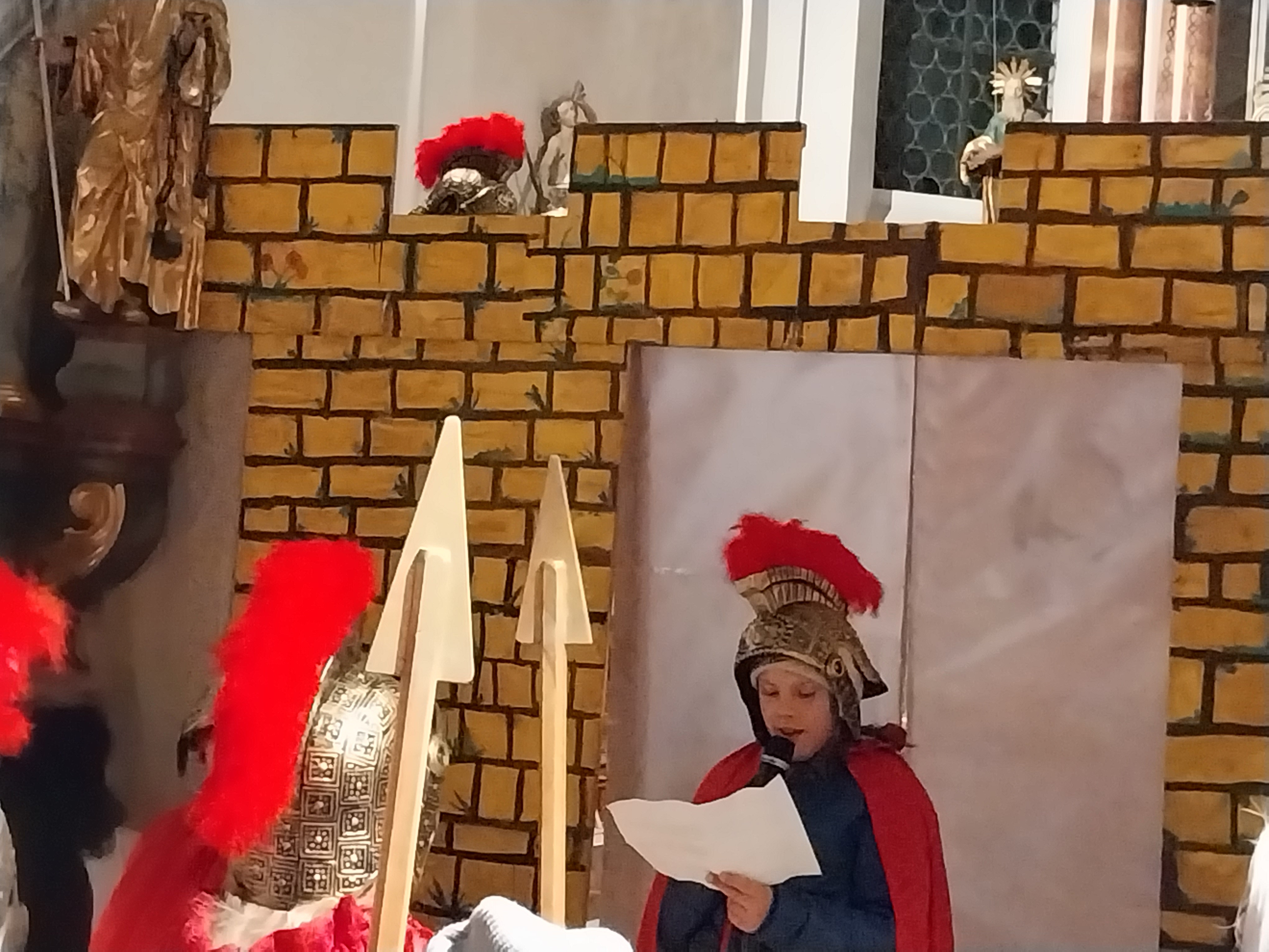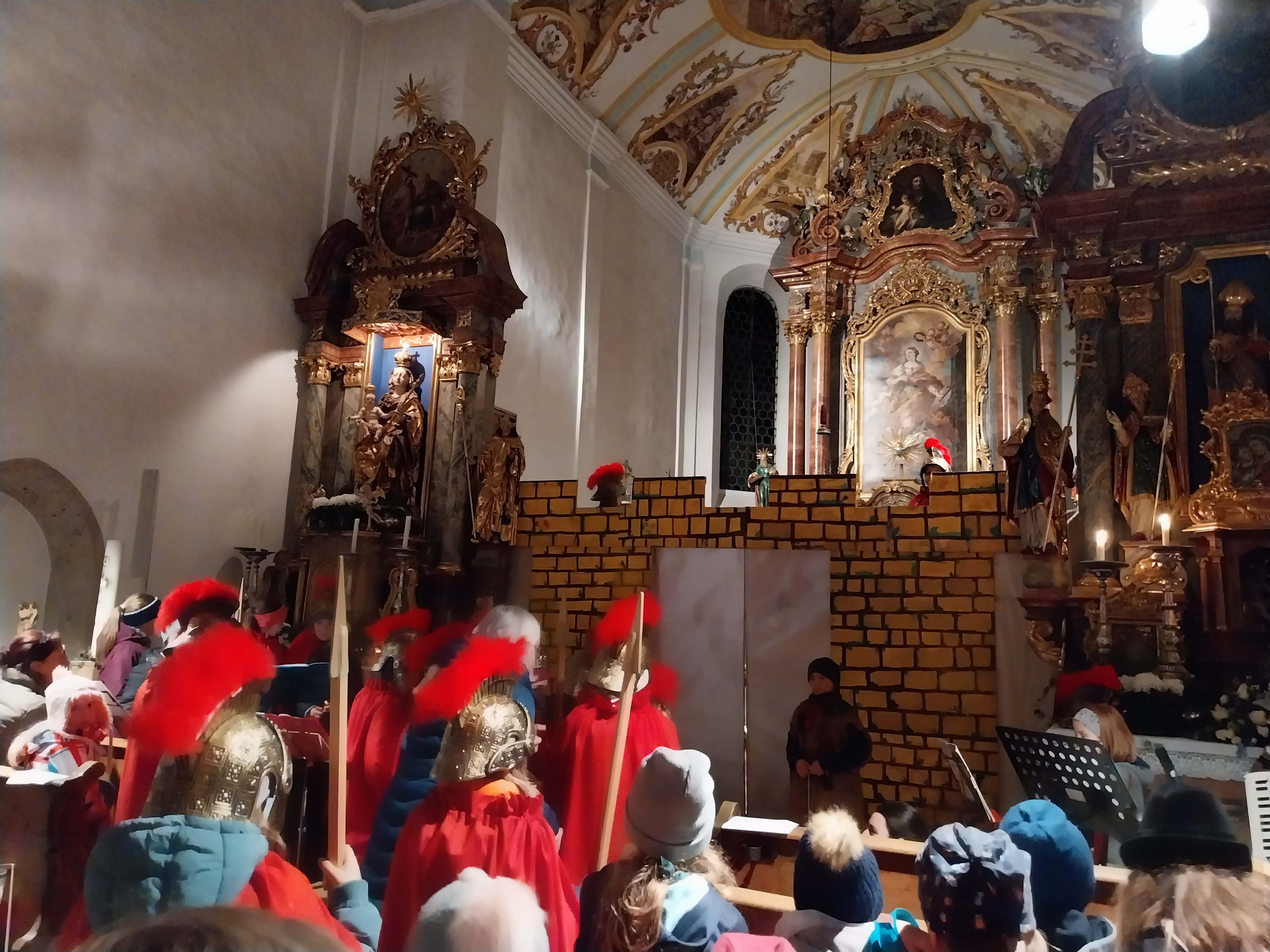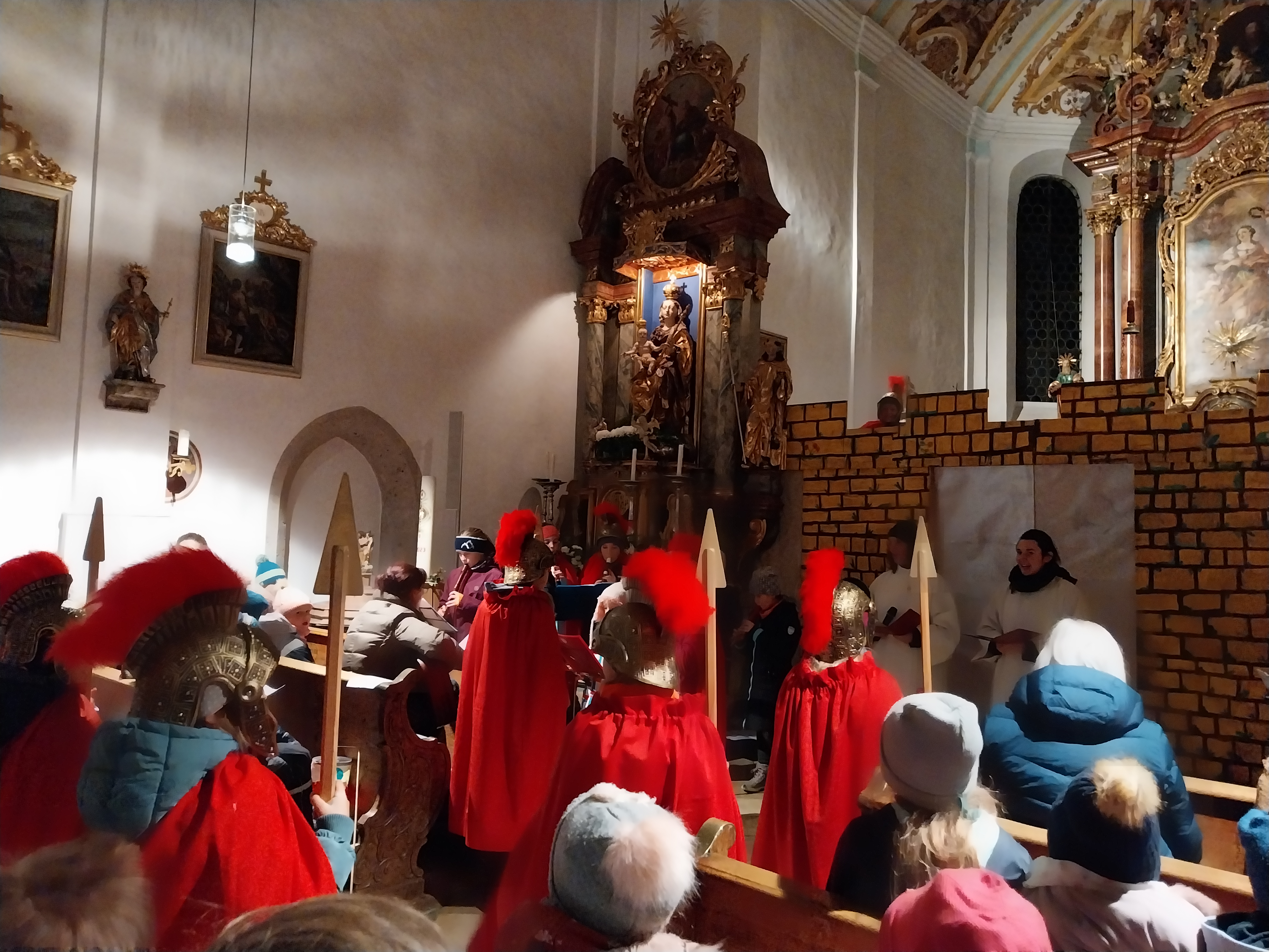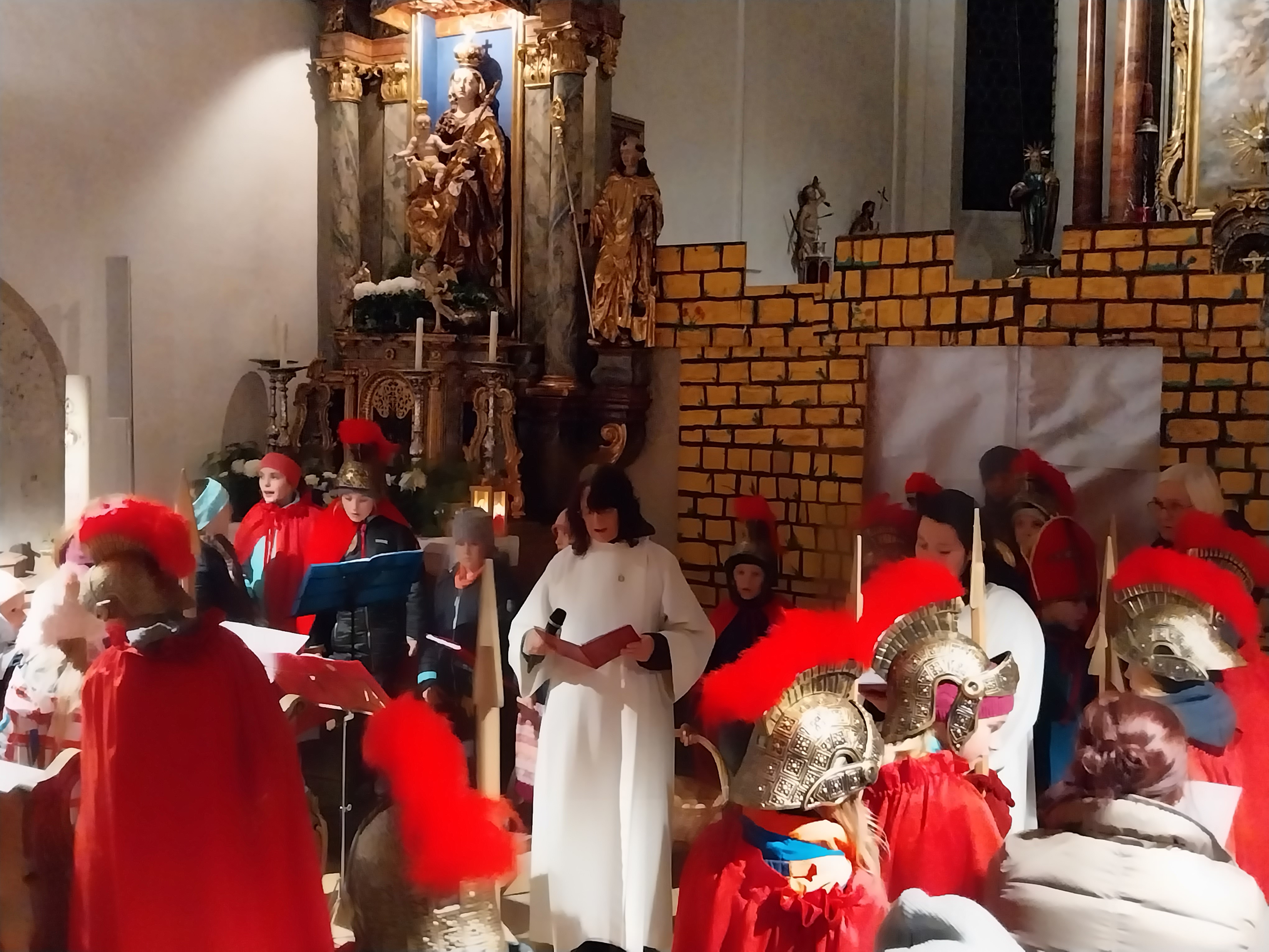 Nach einer kleinen Runde über die Hauptstraße bog der Martinszug in die Waller Kirche ab, in der Frau Kainz eine Wortgottesfeier hielt. Traditionell durfte hier das Martinsspiel der großen SchülerInnen aus der 3/4 nicht fehlen. Textsicher überbrachten die kleinen römischen Soldaten die Legende vom Heiligen Martin und seiner Mantelteilung. Das symbolische Teilen einer Semmel durfte zum Abschluss nicht fehlen. Instrumental begleitet wurde die Feier u.a. durch musikalische römische Soldaten.