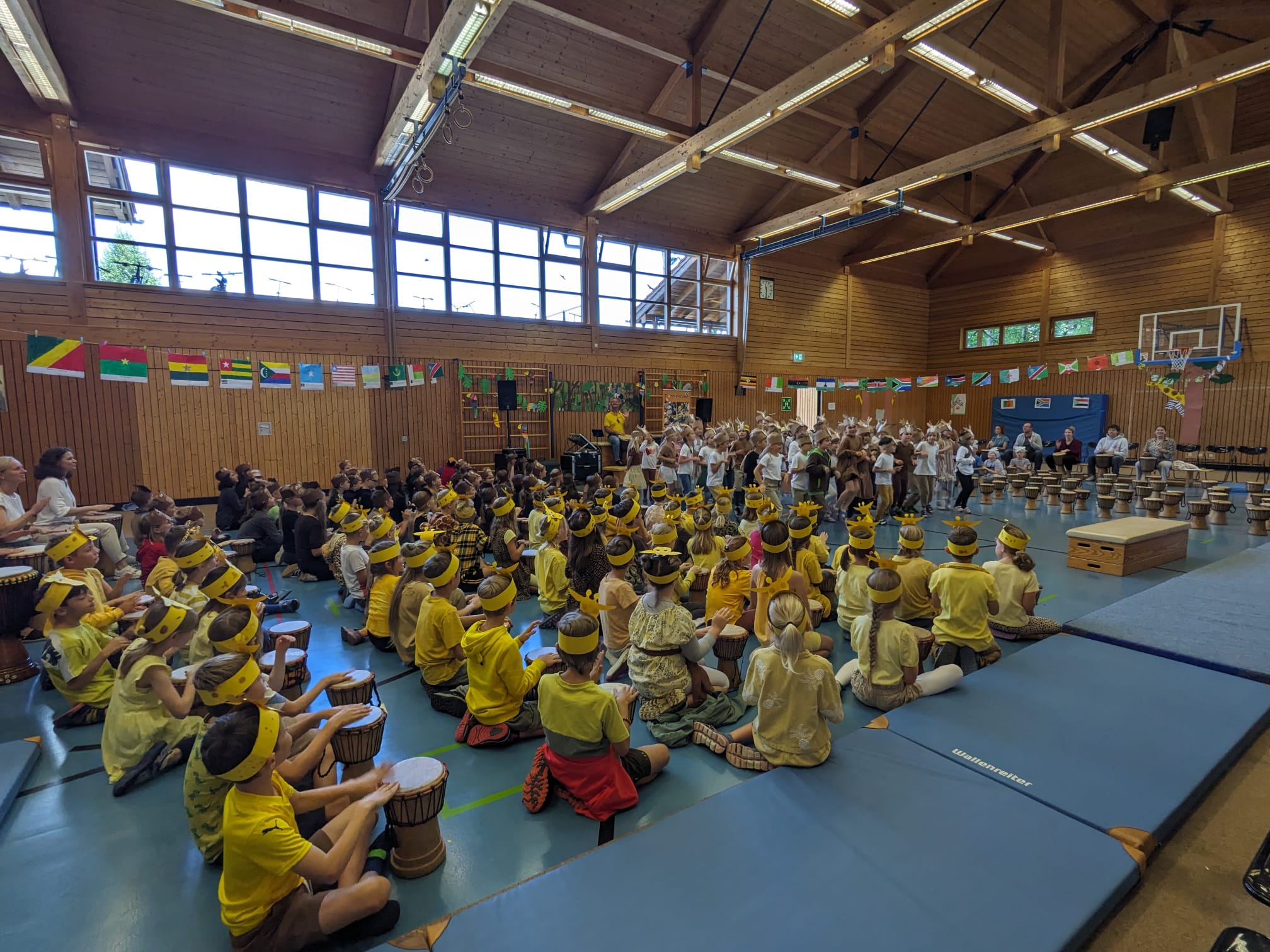 Die Projektwoche endete am Freitag, den 05.07.24, mit einem tollen und beindruckenden Highlight für alle Kinder: Einem Trommelkonzert für die ganze Familie und Freunde der Schulfamilien Wall und Warngau in der Turnhalle. Wir möchten uns an dieser Stelle recht herzlich bei Otto Klösel, unserem Trommelzauberer, bedanken, der uns mit viel Engagement und Herzblut auf die Reise nach Tamborena, dem Trommelzauber- Dorf in Afrika, begleitete hat.