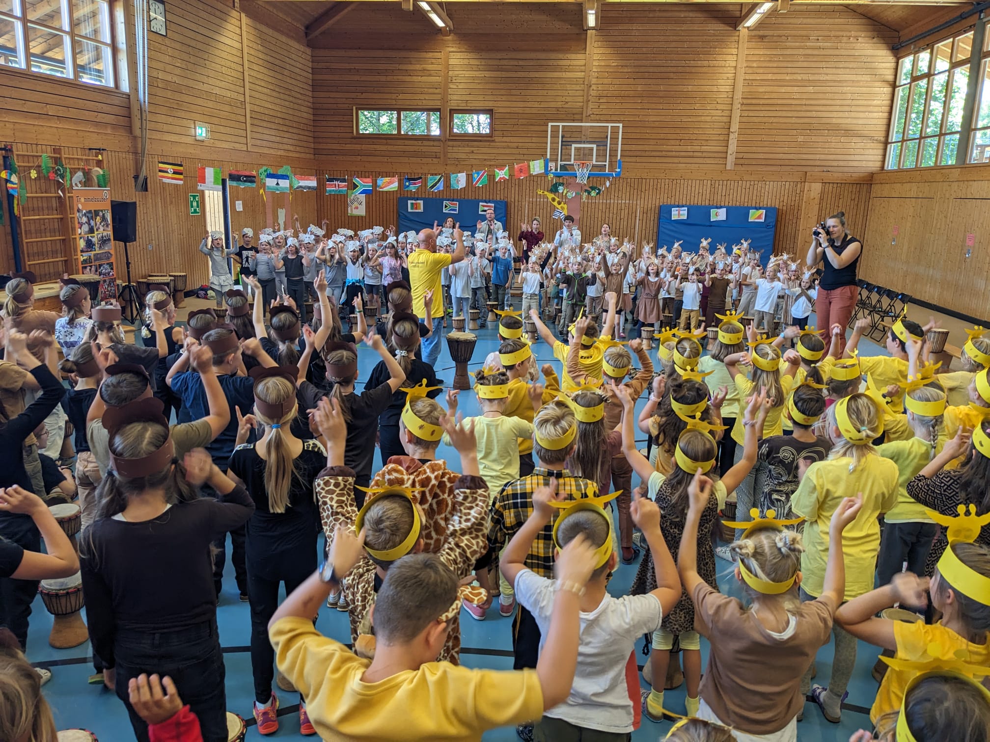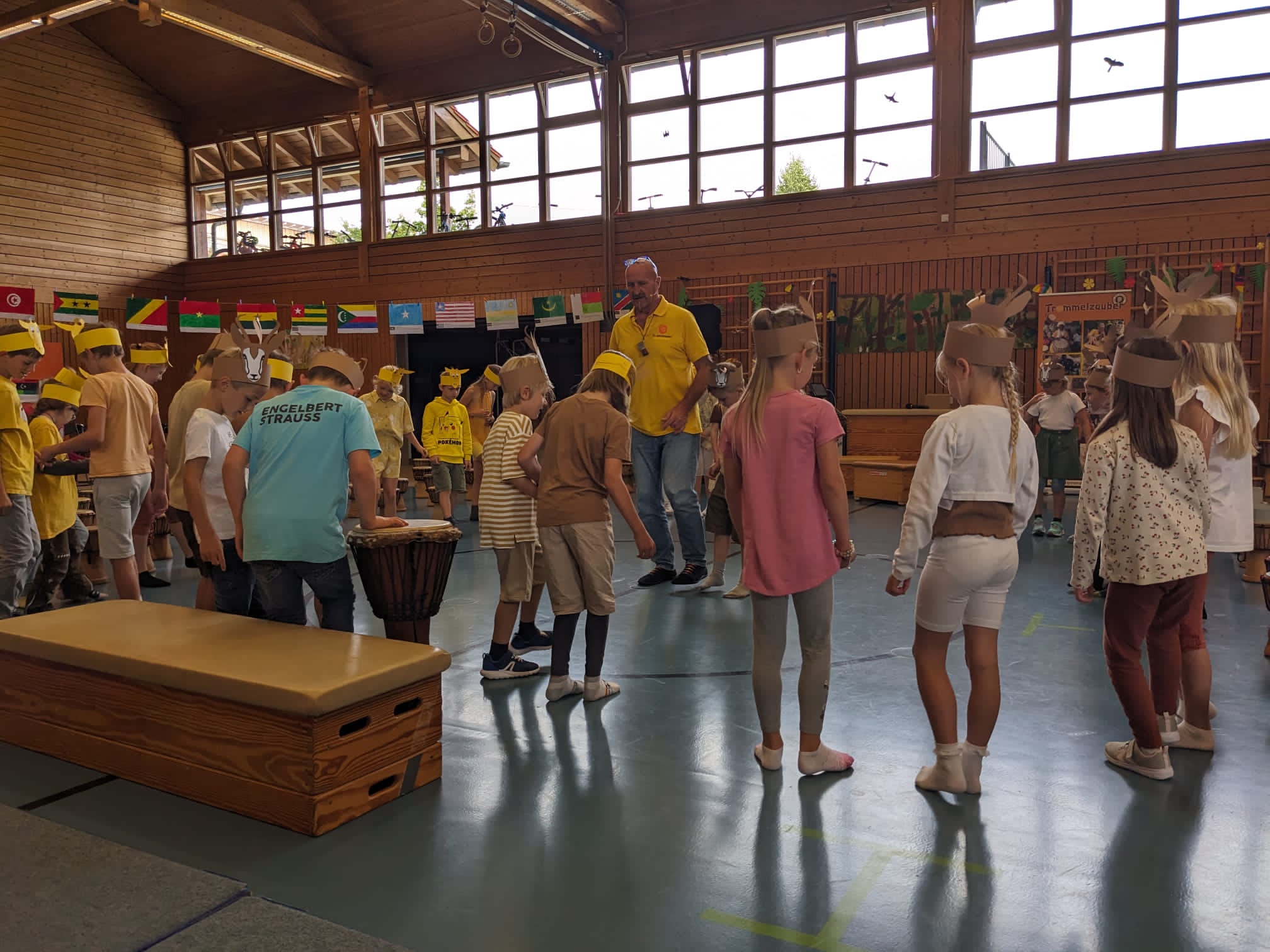 In der Woche vom 01.07.24-05.07.24 machten wir ins jeden Vormittag klassenweise mit dem Bus nach Warngau in die Turnhalle auf, um dieses schöne Erlebnis mit allen Schülern und Schülerinnen der GS Warngau teilen zu können. Die Kinder erhielten von ihrem Reiseleiter eine Einladung nach Tamborena, dem Trommelzauber-Dorf in Afrika. Also: Anschnallen und die Rücklehne aufrecht stellen! Die Projektwoche „Tambo Tambo“ unter der Leitung von Otto Klösel, als Trommelzauberer, konnte beginnen. Nach einem gemeinsamen Morgen-Trommel-Gruß probten die Schüler und Schülerinnen klassenweise und schlüpften unter anderem auch in die Rollen verschiedener Tiere in Afrika. Die 1. Klässler*innen waren die flinken Garzellen, die Kinder der zweiten Jahrgangstufe Giraffen. Alle Schüler*innen der 3. Klassen durften Elefanten repräsentieren und Kinder der 4. Jahrgangstufe schlüpften in die Rolle wilder Affen. Alle Schüler und Schülerinnen waren die ganze Woche motiviert und engagiert dabei und bereiteten sich mit altersgerechten Rhythmen, Tänzen und Liedern auf die Reise nach Tamborena vor. In der trommelfreien Zeit lernten die Kinder etwas über das Land, die Menschen und Tiere Afrikas. Es wurde gebastelt, gesungen und das Abschluss-Konzert weiter vorbereitet.