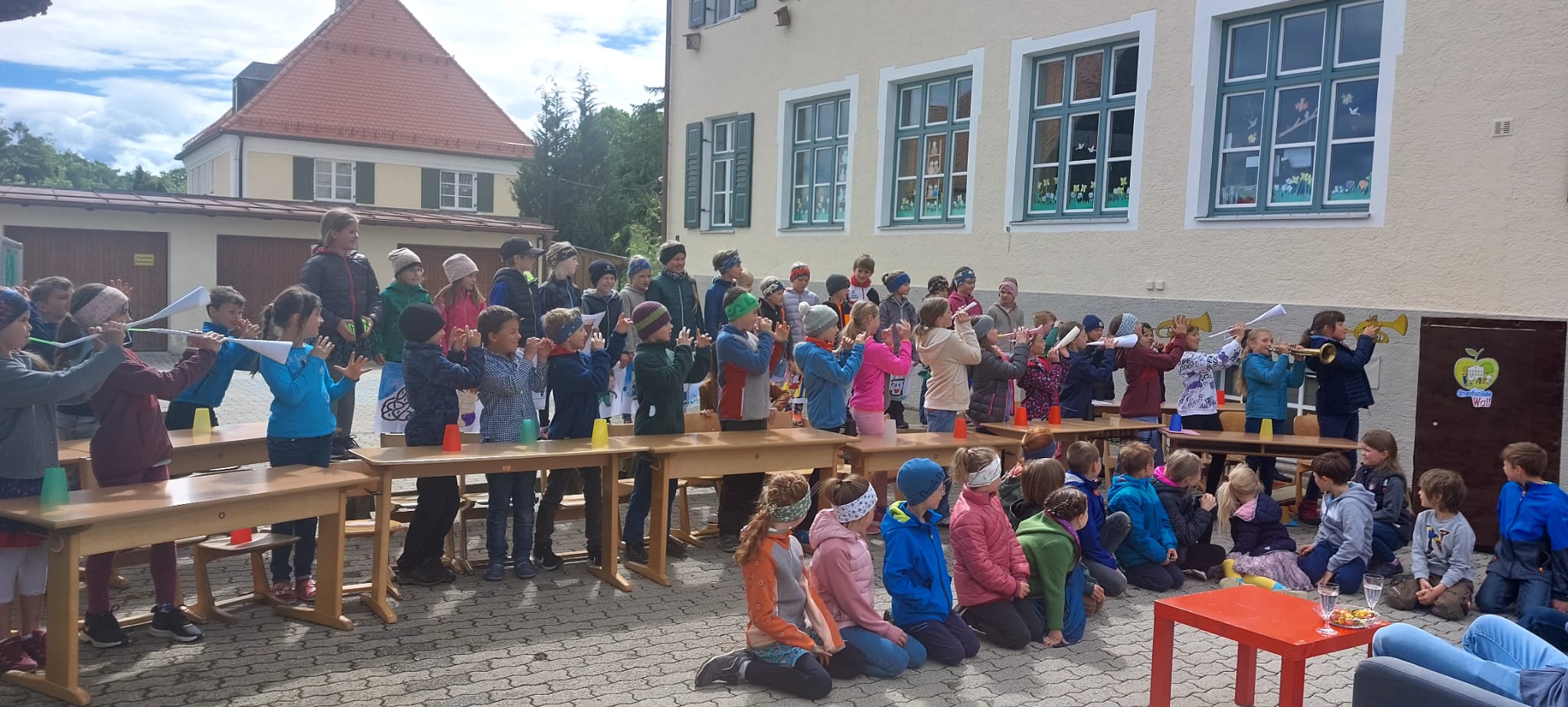 Am 21. September war es soweit, der alljährliche Schulobstgartentag. Wie schon in den letzten Jahren organisierte Frau Staude mit Sepp Stoib vom Waller Gartenbauverein diesen Erntetag. Aus zeitlichen Gründen konnte uns Herr Stoib dieses Jahr nicht unter die Arme greifen. Zusammen mit Frau Hampel, 1. Vorsitzende vom Waller Gartenbauverein, eröffnete die gesamte Schulgemeinschaft dieses 1. Projekt in Schuljahr 2023/24 Aber in diesem Jahr war es anders als sonst. Wir konnten keine Äpfel ernten. Kein einziger Apfel war zu sehen. Das heißt, wir haben in diesem Jahr keinen Apfelsaft. Schade! Die Apfelblüte konnte sich wegen des kalten Frühjahres nicht entwickeln, und somit wuchsen keine Äpfel. Aber zum Glück haben wir noch eine weitere Obstart im Schulgarten, und das in Hülle und Fülle. Die Birnen. Sie wuchsen so üppig auf der Südseite des Schulhauses, sogar bis ins Lehrerzimmer hinauf. Herr Staude kraxelte mutig auf der Leiter fast bis zur Wohnung der Vogts hinauf. Ein gefährliches Unterfangen. Zusammen pflückten wir fast 2 Schulstunden lang. Die Kinder füllten die Eimer und legten die Birnen in die 10 Obstkisten, die schließlich randvoll gefüllt waren. Insgesamt waren es über 200 kg Birnen. Das Fallobst naschten die Kinder gleich zur Pause. Die reifen Birnen lagerten wir in den Klassenräumen, die Kinder konnten täglich eine Birne essen oder mit nach Hause nehmen. Die noch harten Birnen ließen wir reifen. Nach zwei Wochen war es dann soweit. Wir kochten Birnenmarmelade. Am 5. Oktober verwandelte sich der Werkraum im 1. Stock der Schule in eine Marmeladenküche. Als Einstimmung hörten die Kinder die Geschichte vom Marmeladenwolf, der Marmelade aufs Brot bevorzugte. Jedes Kind hatte ein Marmeladenglas dabei. Als erstes mussten die Birnen ordentlich geschnitten und entkernt werden. Mit großen Töpfen, Herdplatten, Mixer und den Zutaten wie Gelierzucker und Zimt, konnte es losgehen. Im ganzen Schulhaus duftete es nach köstlichen Birnen und Zimtzucker. Jedes Glas wurde mit einem selbst geschriebenen und gemalten Schildchen ausgeschmückt, dazu durfte ein Stück Stoff für den Deckel nicht fehlen. Der Elternbeirat war so freundlich und spendierte den Gelierzucker. Vielen Dank dafür!