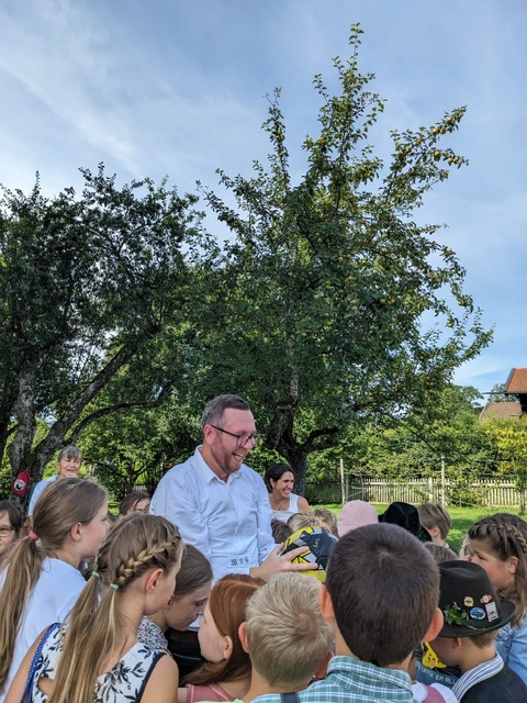 So schnell vergingen die vier Jahre Grundschulzeit und am 26.07.24 erlebten Vierties ihren letzten Tag in der Grundschule. Gebührend wurden sie von der Schulgemeinschaft verabschiedet. Herr Staude kehrte die Buben sowie Madeln mit dem berüchtigten Besen aus unserem Schulhaus und anschließend liefen sie unter Jubelgeschrei durch das Spalier der Erst-, Zweit- und Drittklässler. Frau Birnbeck hielt im Anschluss eine kleine Rede, in der sie das letzte Schuljahr der Grundschulzeit mit all seinen vielen Höhen und schönen Ereignissen Revue passieren ließ.